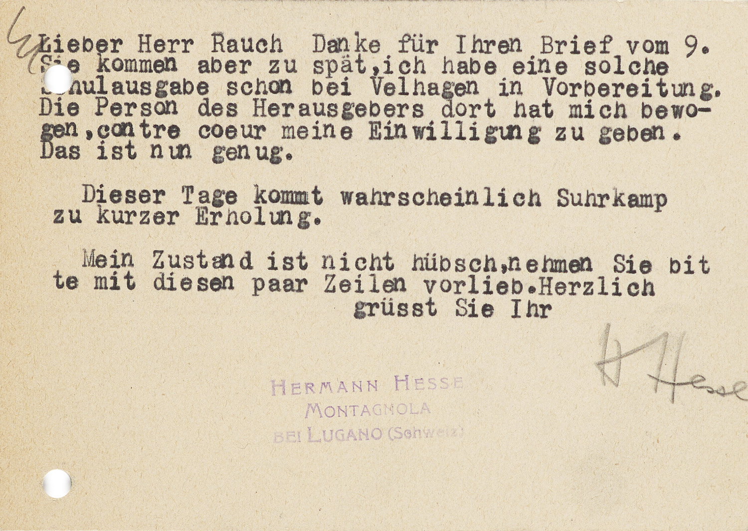 Autographs – Set of 1 signed typewritten letter and 1 signed typewritten postcard to the publisher Karl Rauch in Bad Salzig and Boppard am Rhein. Undated. (1951). - "You come ... too late, I already have such a school edition in preparation at Velhagen ... These days Suhrkamp will probably come for a short rest. My condition is not pretty ..." (transl.). - Card with Hesse's stamp. - Each punched (minor loss of letters), letter with horizontal centrefold, card slightly fingerstained in places, overall well preserved.