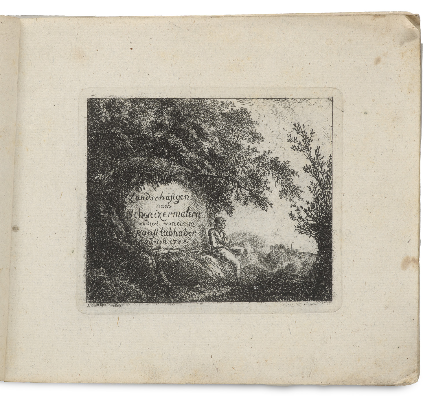 Kunstwissenschaften – Lonchamp, Manuel du bibliophile suisse bzw. Bibliographie générale des ouvrages publiés ou illustrés en Suisse et à l'étranger de 1475 à 1914, 2057. - Nagler III, 2585. - Von größter Seltenheit, nur 2 Exemplare weltweit im KVK/Worldcat (SNB, Zürich, Library of Congress, Washington), kein Exemplar im Internationalen Handel nachweisbar. Das gestochene Titelblatt ist ein Originalentwurf von Meyer, die folgenden 11 Landschaftsansichten, die Meyer ebenfalls gestochen hat, sind von Werken von Ludwig Meyer von Knonau, Salomon Gessner, Johann K. Wuest, Heinrich Freudweiler, Ludwig Hess, Johann Kaspar Huber und Conrad Gessner inspiriert. Die Radierungen zeigen Toggenburg, Wasserfall im Oberhasle, italienische Schweiz, Limat, Wallis, Andelfingen, Glanerland, Thur, Sihlwald. - Der Zürcher Maler und Radierer Johann Heinrich Meyer (1755-1829) schuf neben der hier vorliegenden Radierfolge mehrere ähnliche, Schweizer Motiven gewidmentete Werke, u.a. "Malerische Reise in die italienische Schweiz" (1793), "Die Ruinen von Unterwalden (...)" (1801) und "Der Bergfall bey Goldau im Canton Schwytz (...)" (1806). Später malte Meyer, der auch die Zürcher Künstlergesellschaft mitbegründete, transparente Lichtschirmbilder. - Die Radierungen in gratigen Abzügen mit deutlich zeichnender Plattenkante. - Nur selten minimal fleckig, bzw. mit Läsuren. Gut erhaltenes Exemplar.
