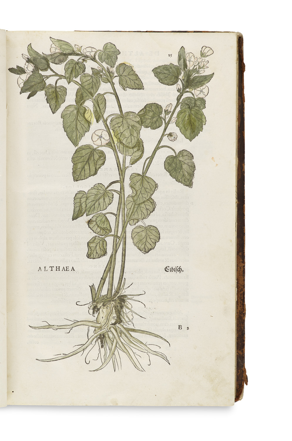 Natural Sciences – Botany. - Herbals. - First edition of one of the most important botanical works of the Renaissance and a milestone in the history of botany. - VD16 F 3242 - STC 326 - Nissen BBI 658 - Pritzel 3138. - L. Fuchs describes around 497 plant species, many of which were documented scientifically for the first time, along with their medicinal uses and names in Latin, Greek, and some in German. He drew on ancient sources such as Dioscorides, Pliny, and Galen, but supplemented them with his own observations. The more than 500 woodcuts, which were copied from nature for the first time rather than from older books, were drawn from nature by A. Meyer, transferred to wood by H. Füllmaurer, and carved and printed by Veit Rudolph Speckle. Our copy begins with only 2 index leaves and the herb book (without title, etc., and the first 12 leaves, without the portrait of L. Fuchs). 7 leaves replaced by facsimile leaves (leaves 155/6, 189/90, 245/6, 329/30, 689/90, 807/08, 827/8). Approx. last 120 leaves with missing section in lower right corner, becoming larger towards the end with minimal loss of text, upper right corner slightly and inconspicuously damp-stained at the beginning, occasionally slightly stained, overall a good, clean copy.