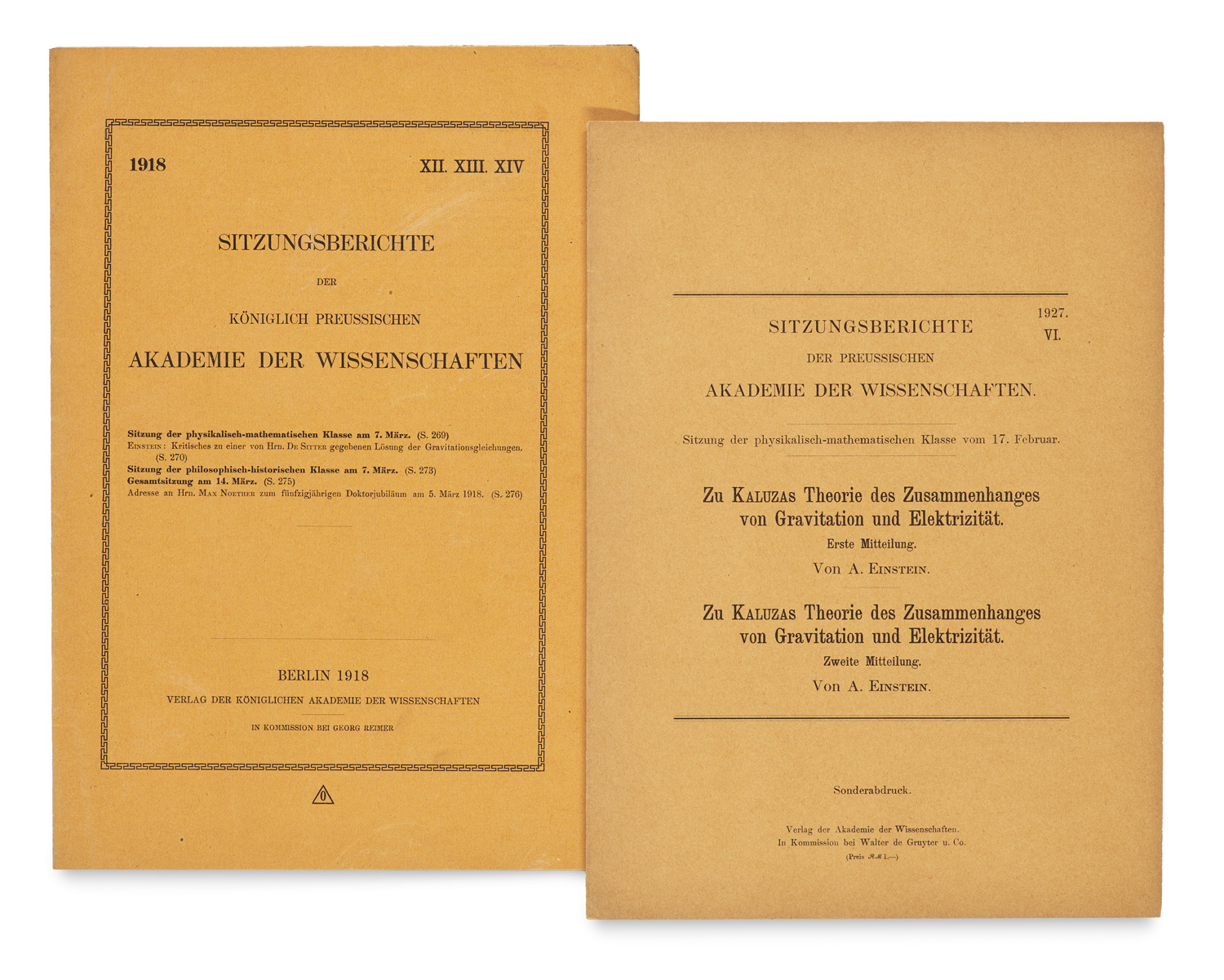 Kritisches zu einer von Hrn. De Sitter gegebenen Lösung der Gravitationsgleichungen. Erster Separatdruck. Und: Zu Kaluzas Theorie des Zusammenhanges von Gravitation und Elektrizität. Erste u. zweite Mitteilung. 2 Tle. i. e. H. Erster Sonderabdruck. (= Sitzungsberichte der (Königlich) Preussischen Akademie der Wissenschaften, XII (1918) u. VI (1927). Sitzungen der physikalisch-mathematischen Klasse am 7. März 1918 u. 17. Februar 1927. Berlin: Verlag der (Königlichen) Akademie der Wissenschaften (Komm. Reimer (Reichsdruckerei), 21. März 1918, Ss. 269-277 (1) u. 14. März 1927, Ss. 23-30. Gr.-8°. OBr. mit Umschl.tit.