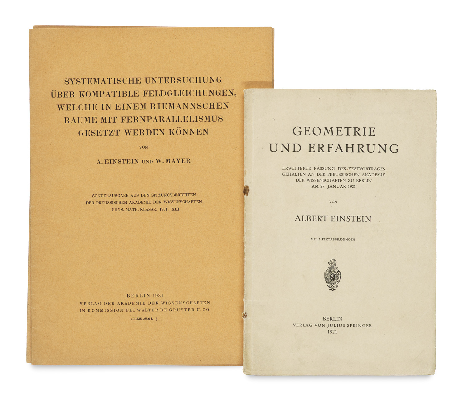 Riemann-Geometrie mit Aufrechterhaltung des Begriffes des Fernparallelismus. Erster Sonderabdruck. Und: Systematische Untersuchung über kompatible Feldgleichungen, welche in einem Riemannschen Raume mit Fernparallelismus gesetzt werden können. Gemeinsam mit Walter Mayer. Erster Sonderabdruck. (= Sitzungsberichten der Preussischen Akademie der Wissenschaften, physikalisch-mathematische Klasse, XVII (1928) und XIII (1931). Berlin: Verlag der Akademie der Wissenschaften (Komm. Reimer (Reichsdruckerei)), 10. Juli 1928, 7 (1) S. u. 30. Mai 1931, 11 (1) S. Gr.-8°. OBr. mit Umschl.tit.