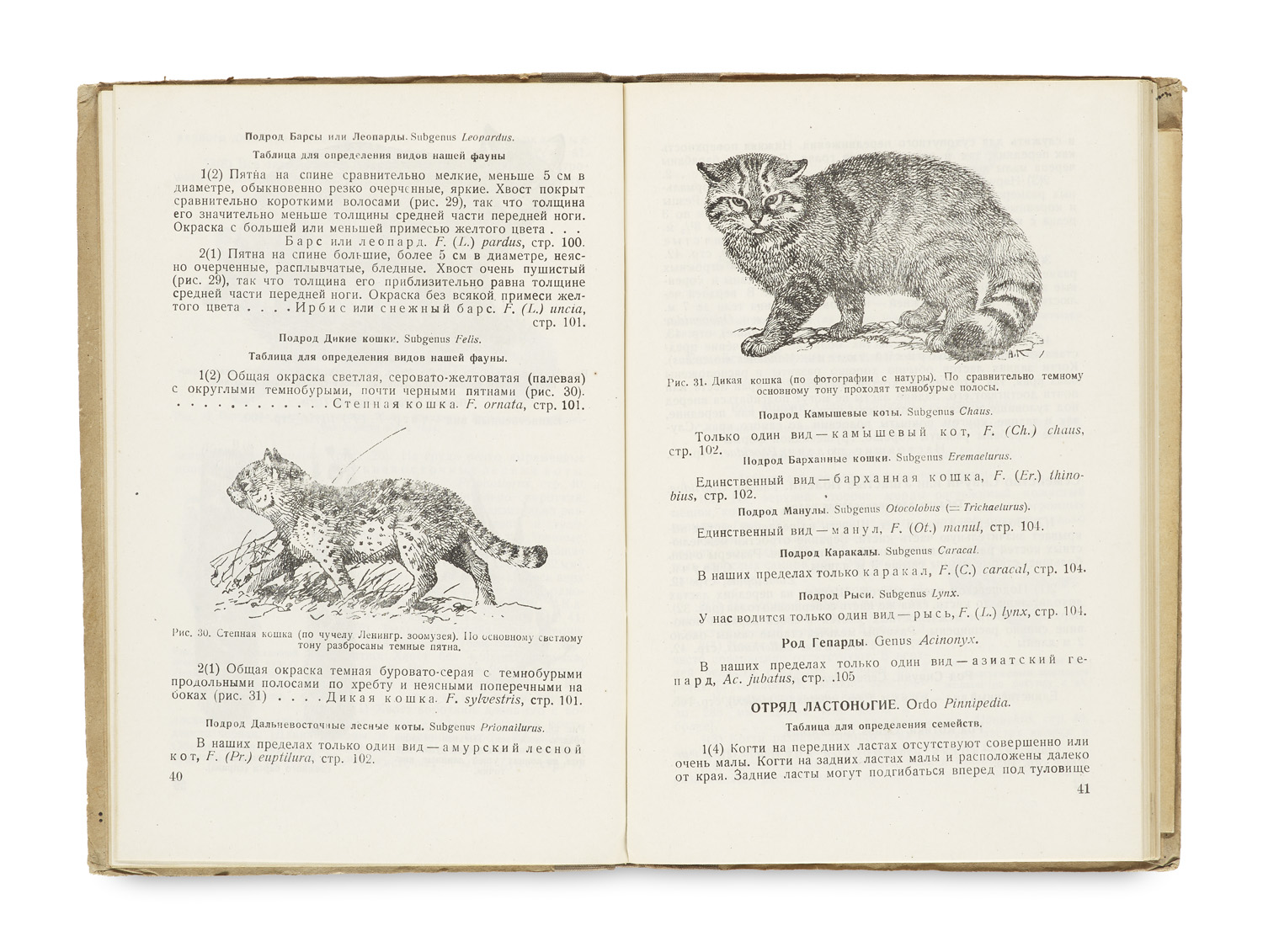 Opredelitel' ochotnitsch'ich i promyslowych swerej SSSR. (Bestimmungshandbuch für Wild- und Nutztiere der UdSSR.) Mit einer gefalteten Karte und zahlreichen Textillustrationen nach Zeichnungen. Moskau, Vlg. d. Vereinigten Genossenschaften, 1935. 134 (2) S. 8°. OHln. mit Deckeltit. in rot u. schwarz (etwas beschabt und berieben, Aussensteg mit Lichtrand).