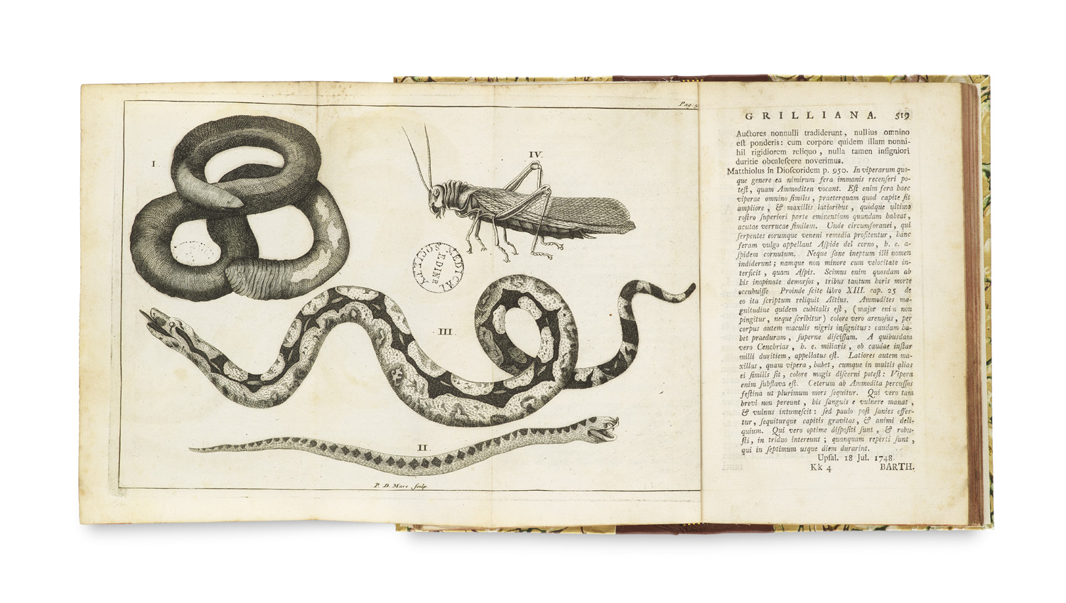 Natural Sciences – Rare zoological account on Suriname, richly illustrated with 3 folding copper engraved and additionally etched plates by P. D. Marc, depicting a total of 10 figures. - Doctor's theisis of Peter Sundius (1729-86), a physician who earned his doctorate in Uppsala and later practised in Oslo. Plates with copper engravings of clear contrast with additional burnished etching. - With: Two further doctor's papers from an anthology of 19 supervised by Carl von Linné in his capacity as professor in Uppsala: 1. Barthold Rudolf Hast. Amphibia Gryllenborgiana. (Ibid., No. 18), pp. 520-55. - 2. Laurenz Balk. Museum Adolpho-Fridericianum principis. (Ibid., No. 18), pp. 556-610. - Title page with owner's notes, slightly foxed in places, otherwise clean.