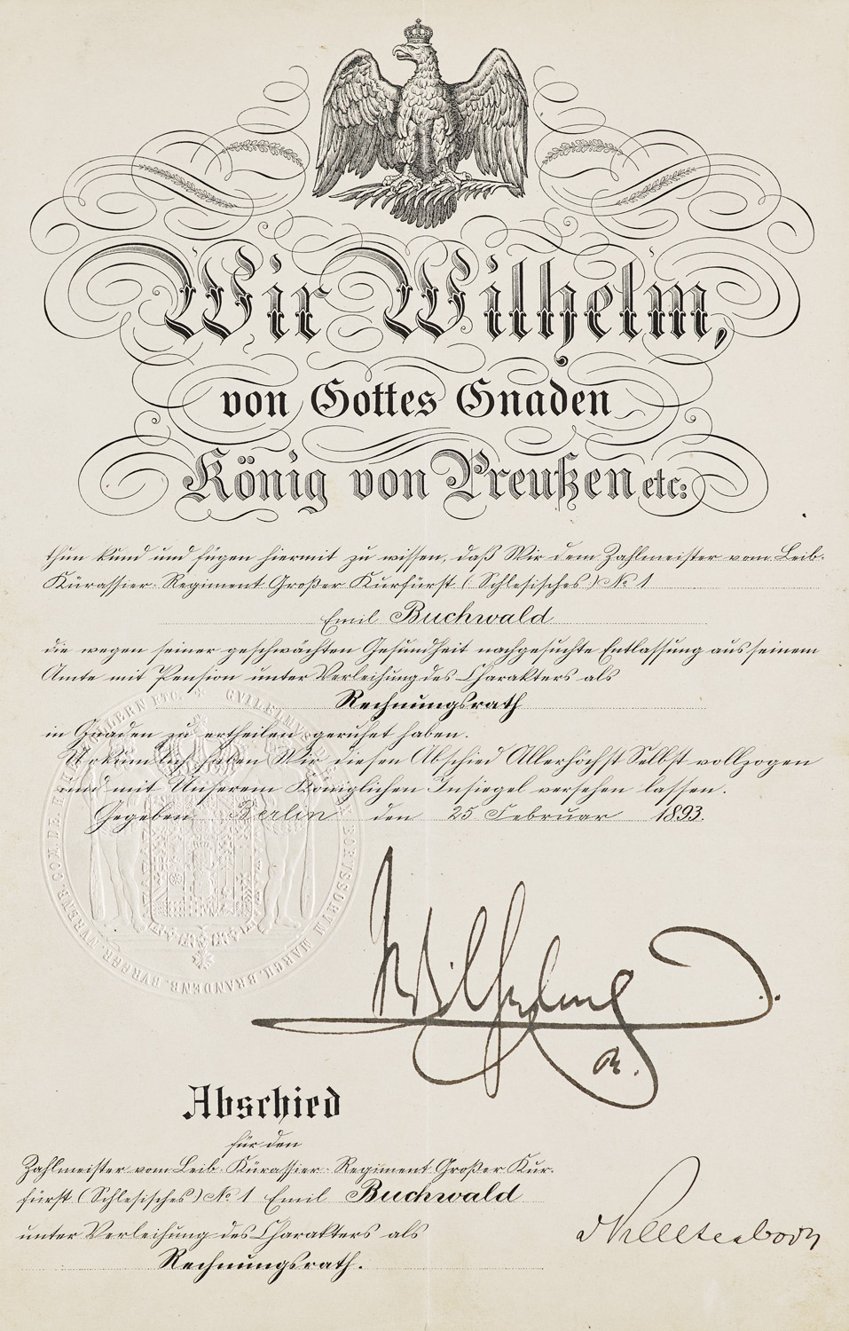 Autographen – Enthält: König Friedrich II. (1712-1786) Collations-Patent mit eh. U. für Gedeon von Benoit, Legationsrat und Resident in Warschau, für das Stift zu Camin. Berlin, 31. Jan. 1764. 3 S. auf 2 Doppelbl. mit papiergedecktem Siegel. - Königin Elisabeth Christine (1715-1797). Brief mit eh. U. der Gattin Friedrichs des Großen. Ebd., 9. Jan. 1751. Halbe S. auf 1 Bl. - Dankschreiben für Glückwünsche zum Jahreswechsel. - Dies. Brief mit eh. U. an die "Regierung des Fürstenthums Halberstadt" mit Dank für die Wünsche zum Jahreswechsel. Magdeburg, 15. Jan. 1763. 1 S. auf 1 Bl. - König Friedrich Wilhelm II. (1744-1797) Brief mit eh. U. an "Major und Flügel-Adjutant von Boeltzig" wegen der Ernennung zum Assessor beim Oberkriegs-Kollegium. Potsdam, 8. April 1791. 11 Z. auf 1 Doppelbl. - König Friedrich Wilhelm III. (1770-1840). Brief mit eh. U. an einen n.g. Militär. Berlin, 22. Aug. 1811. 6 Z. auf 1 Doppelbl. (Falz gerissen). - "Zum Beweise meiner Theilnahme an Ihrer ökonomischen Lage ... mach ich Ihnen mit beikommenden 50 Thalern ein Geschenk." - August Wilhelm Anton Graf Neidhardt (seit 1814) Gneisenau (1760-1831). Eh. Brief mit U. an Herrn von Werder wegen der Dotationsangelegenheit". Erdmannsdorf, 22. Feb. 1817. 1 S. auf 1 Bl. - Friedrich Wilhelm III. hatte dem verdienten Feldmarschall 1816 Erdmannsdorf mit Schloß und Park geschenkt. - Friedrich Wilhelm IV. (1795-1861). Brief mit eh. U. an die Bürgerschaft zu Naumburg am Bober mit einer freundliche Absage einer Übernachtung. Ebd., 23. Aug. 1840. - (Spät. König) Wilhelm I. (1797-1888). Brief mit eh. U. an "Ein königlich Hochlöbliches Kriegs-Ministerium". Berlin, 15. Jan. 1830. 1 S. auf 1 Bl. - Anzeige, "daß bei der Garnison Compagnie ... sich keine zur Aufsicht bei der Schulabteilung des Lehr Infanterie Bataillons geeignete Unteroffiziers befinden." - König Wilhelm II. (1859-1941). Abschiedsurkunde mit eh. U. für den Zahlmeister "vom Leib Kürassier Regiment Großer Kurfürst Nr. 1 Emil Buchwald unter Verleihung des Charakters als Rechnungsrath". Ebd., 25. Feb. 1893. - Harry Graf Arnim von Suckow (1824-1881, preuß. Diplomat). Eh. Brief (frz.) mit U. Ouchy, 10. Mai (1875?). 10 Z. auf 1 Bl. - Philipp Fürst zu Eulenburg (1847-1921). Eh. Brief mit U. 25. April 1887. 1,5 S. auf Briefbogen der Dt. Botschaft in Wien. - Friedrich von Holstein (1837-1909, Diplomat). Eh. Brief mit U. an den Journalisten Felix von Eckardt. o.O. u. J. 1,5 S. auf 1 Doppelbl. - "Heute hörte ich von höheren Beamten, daß in Folge des Prozesses die Aufmerksamkeit verschiedener Reichstagsfraktionen auf die Camarilla-Frage gerichtet worden ist, und daß unbequeme Anfragen demnächst erwartet werde ..." - Aus der Zeit von Holsteins Kampf gegen die Eulenburg Kamarilla um Wilhelm II. nach seiner Entlassung im April 1906. Fr. von Holstein stand geheim in Opposition zu Bismarck. - Dabei: Gest. Portrait von Gneisenau. - Meist Faltspuren, tls. papierbedingt etw. gebräunt u. leicht knitterig, insg. wohlerhalten.