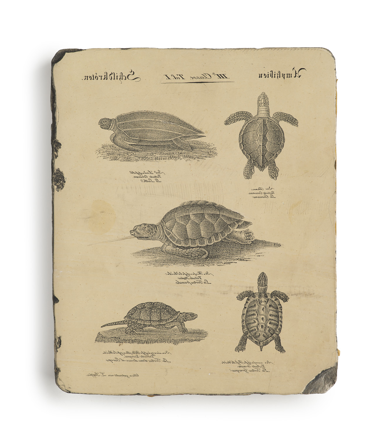 Natural Sciences – Zoology. - Herpetology. - Lithographic stone with five depictions of turtles. Limestone. - This lithographic stone by lithographer Ludwig Steffen shows five different depictions of turtles, including the leatherback turtle and the giant tortoise. The illustrations are each titled in three languages. They were probably intended for a plate in a book. - Slightly stained. Overall, well preserved.