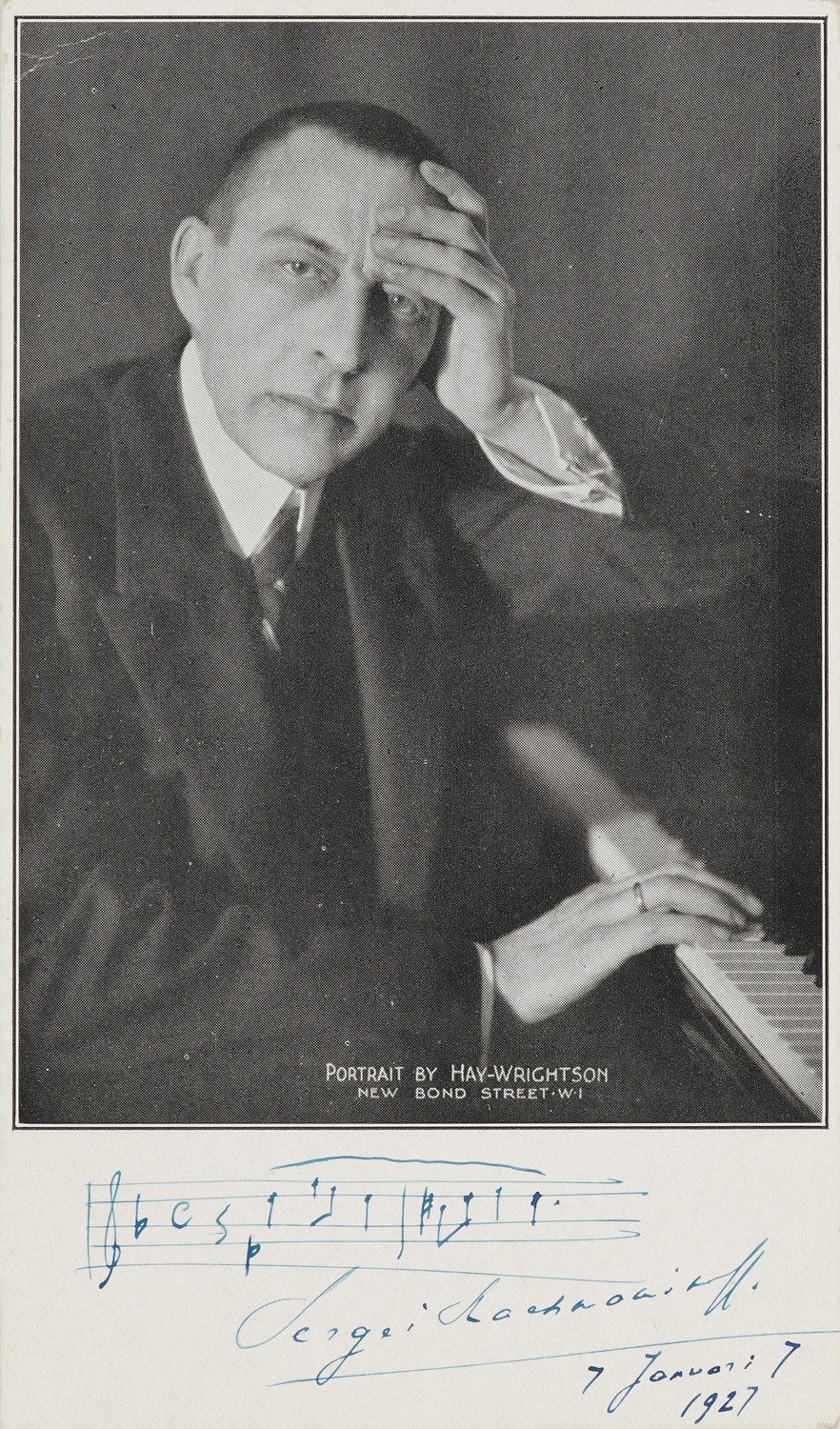 Autographen – Signierte Autogrammkarte des russischen Komponisten, Pianisten und Dirigenten Sergei Rachmaninoff (1873-1943) mit händischem Notenbeispiel des Anfangsmotivs des 3. Klavierkonzertes in d-Moll op-30. Rachmaninoff studierte am Moskauer Konservatorium und wurde im Jahr 1904 Dirigent für das Bolschoi-Theater. Später zog er mit seiner Familie nach Amerika und lebte dort als gefeierter Pianist bis zu seinem Tod. Im Jahr 1927 war Rachmaninoff in Dresden und der Schweiz. - Das Photo wurde von Hay-Wrightson in London angefertigt. - Leichte Randläsuren, obere linke Ecke knickspurig. Insgesamt gut erhalten.