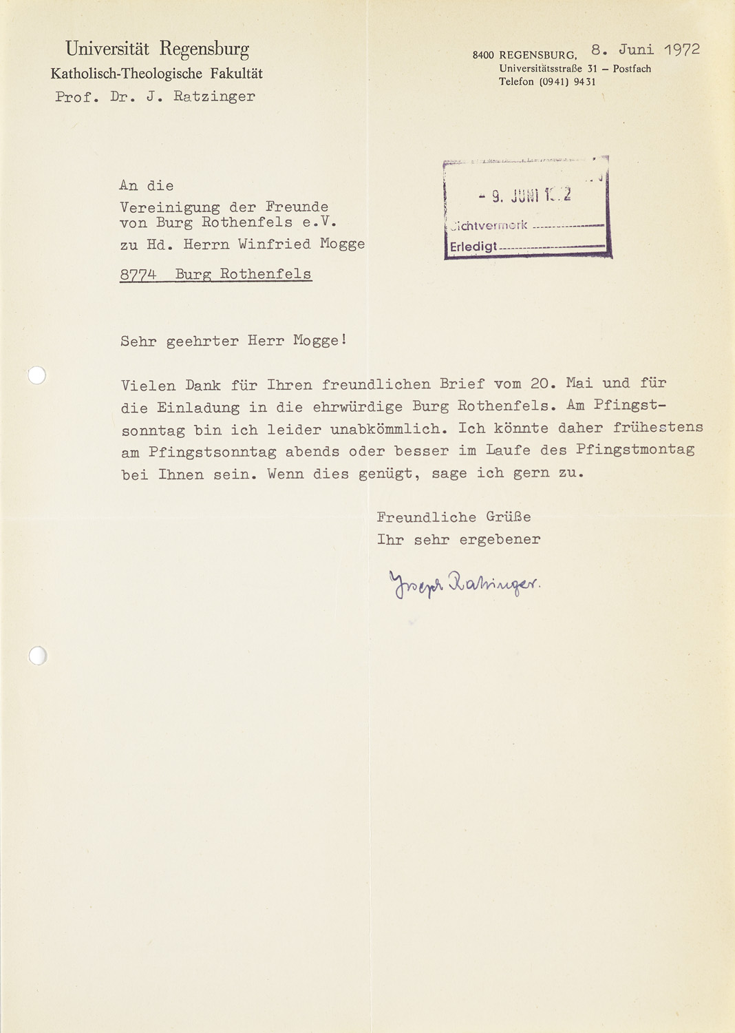 Autographs – 2 typescripts signed by the future Pope as professor of theology to the Germanist Winfried Mogge in Rothefels am Rhein. - Response and decline of an invitation to the annual conference at Rothenfels Castle. - Foldmarks, punched, 1 sheet slightly browned due to paper, otherwise good condition.