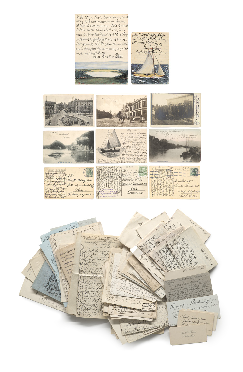 Autographs – Collection of over 435 letters and postcards from and to naval officer Hellmuth von Ruckteschell from his estate. With 2 orig. photos, 2 gouaches, 2 drawings, etc. Around 1904- 1930. With numerous used envelopes. - Hellmuth von Ruckteschell (Hamburg 1890-1948) joined the Imperial Navy as a naval cadet in 1909, was an officer in 1916 and commanded several submarines in 1917. He left the navy in 1919 because the victorious powers were looking for him for war crimes and fled to Sweden and Finland. After returning to Germany under a false name in the 1920s, he completed a carpentry apprenticeship and worked as a carpenter in Oberneuland near Bremen until the 1930s. In 1938, he was promoted by the navy to lieutenant captain in the reserve and was called up for the Second World War, where he commanded the two German auxiliary cruisers 'Widder' and 'Michel'. In 1943, he became military attaché at the German embassy in Tokyo, which was closed with the defeat of Germany in May 1945. Von Ruckteschell was taken prisoner of war by the British and was sentenced to 10 years in prison in 1947 for the sinking of merchant ships. He died in the Fuhlsbüttel prison in 1948. One of his brothers was the sculptor and author Walter von Ruckteschell (1882-1941), his sister Karin later became a deaconess in Kaiserswerth. - Extensive collection of letters mainly with family correspondence, including approx. 180 letters from the parents, the pastor Nicolai von Ruckteschell and his wife Helene (née Baroness Catherina Helene von Engelhardt) from Hamburg as well as 100 letters from Hellmuth v. R. to them, approx. 50 letters from the siblings (mostly from Hans v. R., also Roland (1), 'Ka' (Karin), Greti) and approx. 40 to them, from the cadet school in Plön, at the time (since 1909) as a sea cadet in the Imperial Navy in Kiel, Groß Lichterfelde and in Flensburg-Mürwik, letters from the sea on various ships (SMS von der Tann and others), from the trenches near France in 1916, from Fort Stosch, from Sweden (Gunnebo, Porjus) etc.- Also occ. letters from aunt and uncle and from a few others, including: as listed Above. - In add.: Letter from Ernst Mevert (writer) to Joh. Heim regarding Hellmuth von Ruckteschell's possible emigration with J.P. Müller to Paraguay (1919), 2 telegrams, 5 business cards.- Some on letterhead with blind-stamped monogram, letters from the father mostly on paper and cards with letterhead of the pastorate of the Friedenskirche in Hamurg-Eilbeck, some field post. - Drawing of Ruckteschell's accommodation 'Jägerhyddan' in Porjus. - Partly browned due to paper, only occ. defects (partly backed with adhesive tape) or stains, overall well preserved.