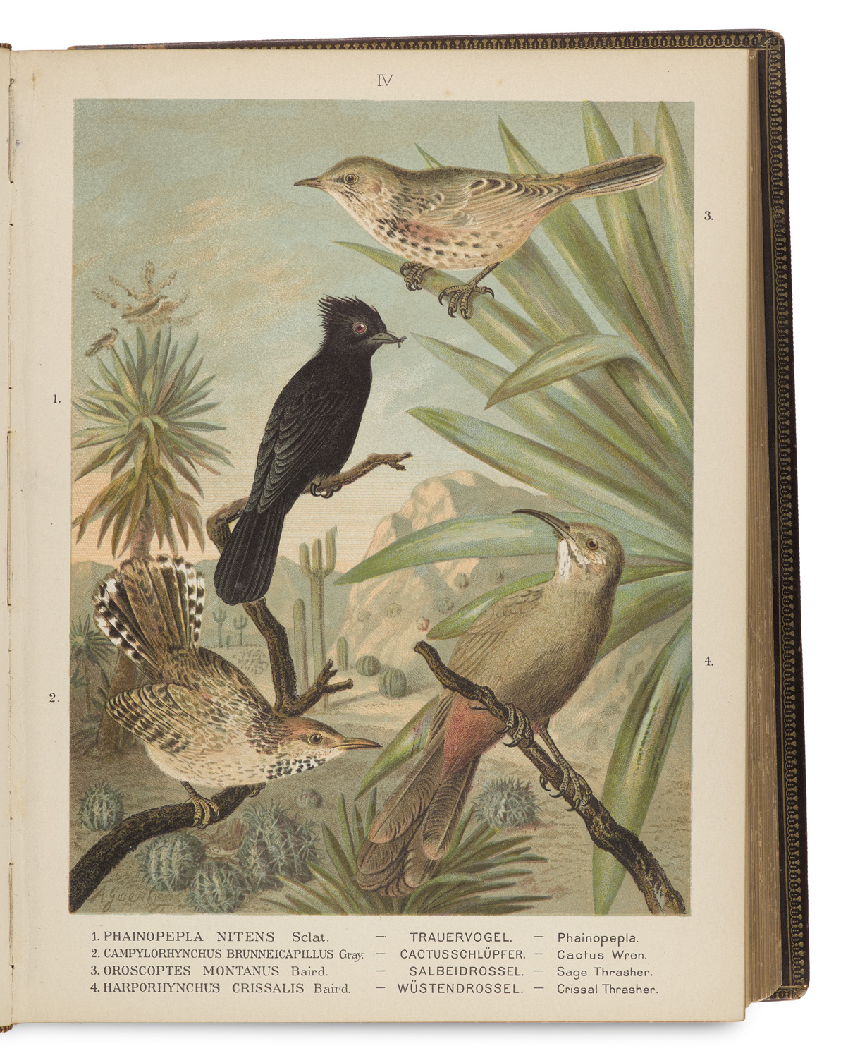 Natural Sciences – Zoology. - Ornithology. - With 36 half-tone plates by E. Kaufmann after drawings by R. Ridgway, A. Göring and G. Mützel, as well as 10 wood-engraved text illustrations. - First edition of the popular account on the birds of North America. - An English edition with the plates of this German first edition was published in 1896. - The colourful plates with mostly several bird illustrations presented in great detail and in natural surroundings. - The superb publisher's binding with a fault at top, worn at corners and edges, spine with shelf-wear and in parts cracked, otherwise a clean copy of this monumental work.