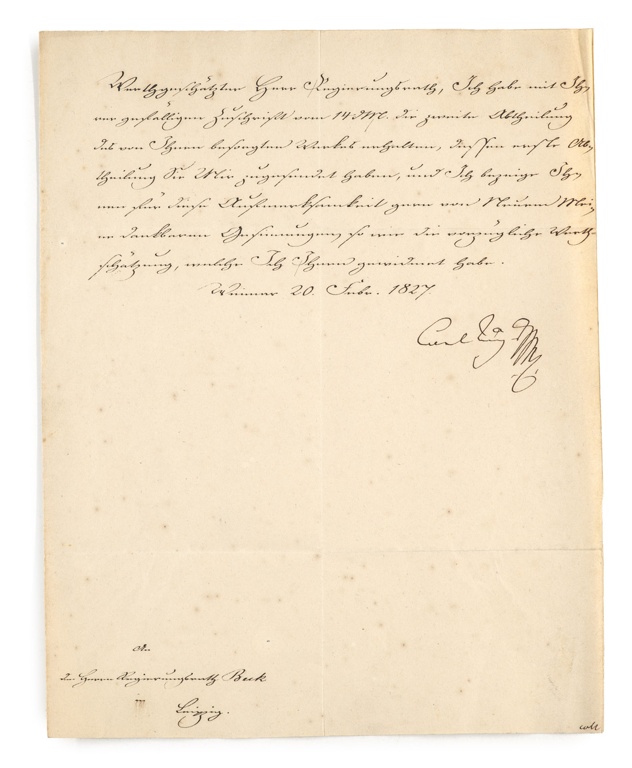 Autographs – Letter signed of Grand Duke Carl August of Weimar-Saxony-Eisenach (1757-1828) to Beck in Leipzig. Weimar, 20 Feb. 1827. Half page on 1 double sheet laid paper with watermark with portrait of Carl August. With envelope with lacquer seal. - Traces of several folds, somewhat brownstained and slightly creased, overall well preserved.