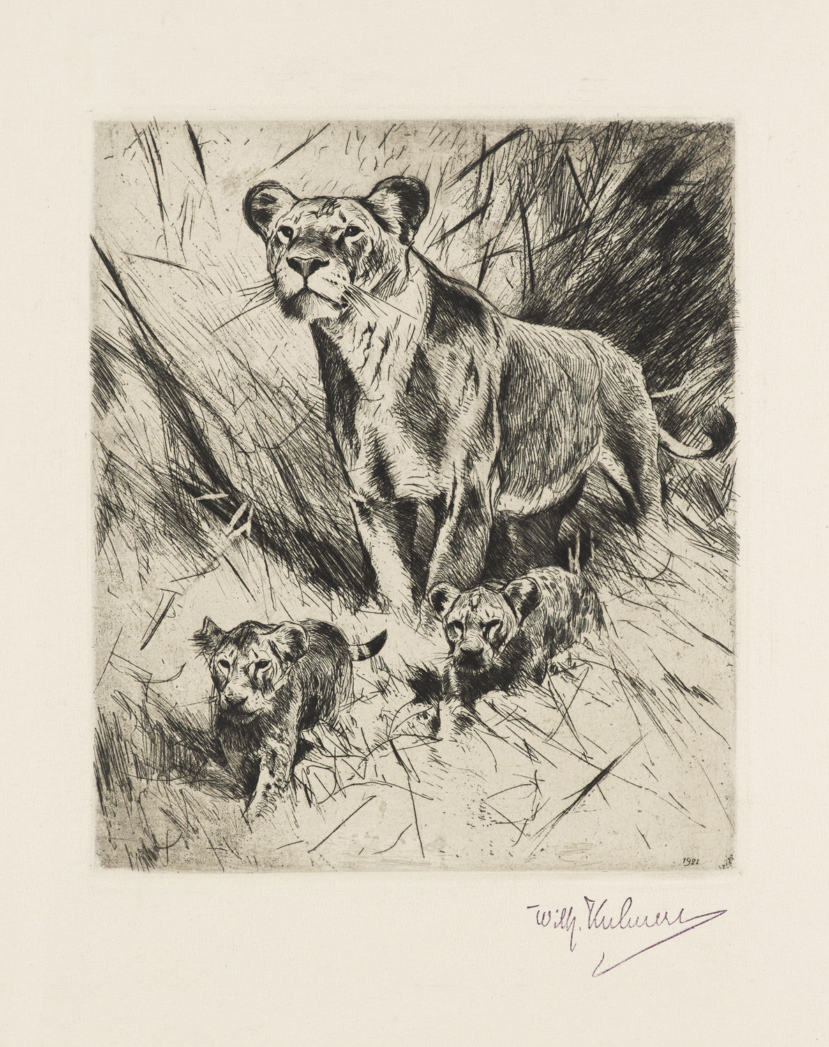 Löwin mit ihren Jungen. 1921. Radierung auf Velin. 21 x 18 cm (38 x 27 cm). Unter Passepartout montiert. Mit Signaturstempel.