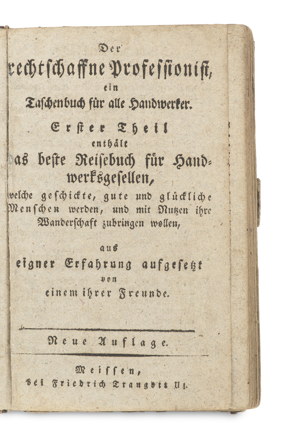 Der rechtschaffne Professionist, ein Taschenbuch für alle Handwerker. 2 Teile in 1 Bd. Mit einer mehrmals gefalteten Tabelle. Meissen, Friedrich Traugott Uz, o.J. (1823). 179 S. 144 S. 12°. Illustrierter OPp mit DTitel (stark berieben und bestoßen, Rücken teils gelöst).