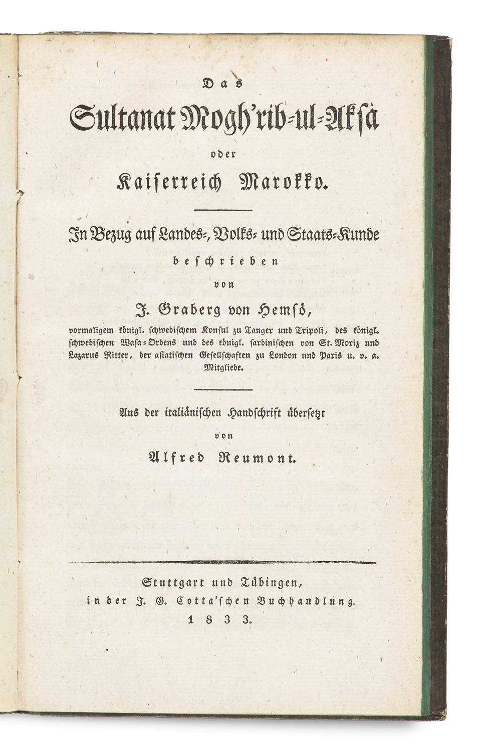 Das Sultanat Mogh'rib-ul-Aksà oder Kaiserreich Marokko. In Bezug auf Landes-, Volks- und Staats-Kunde. Aus der italien. Handschrift übersetzt. Stuttgart, Tübingen, Cotta, 1833. 4 Bll., 196 S. Pp. d. Zt. Mit RVerg. u. RSchd. (leicht beriebven).