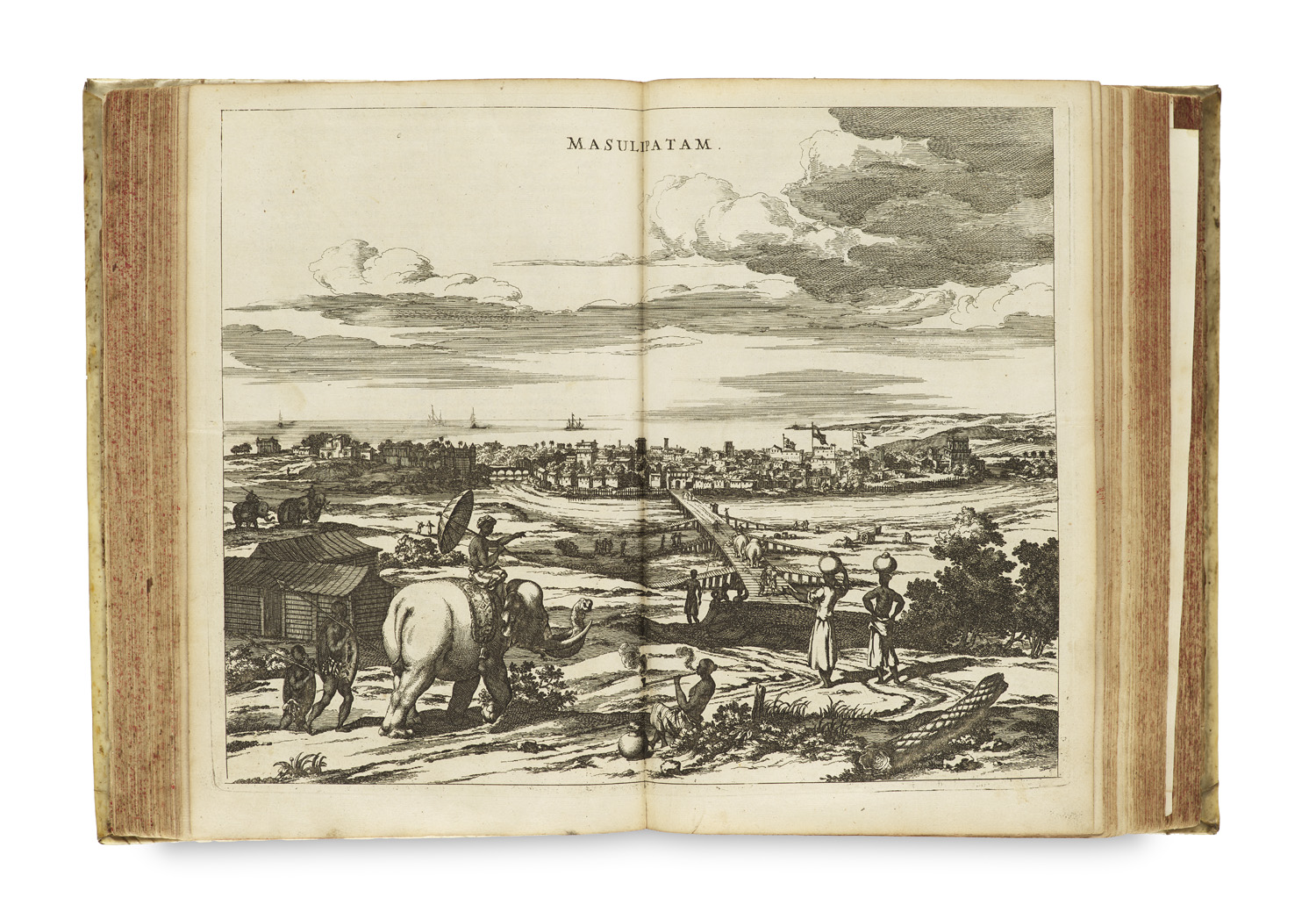 Wahrhaftige ausführliche Beschreibung der Berühmten Ost-Indischen Küsten Malabar und Coromandel, Als auch der Insel Ceylon: Samt dero angräntzenden Reichen. Aus dem Holländ. übersetzt. Mit gest. Titel, 2 Portraitkupfern, 4 doppelblattgr. Karten, 30 _doppelblattgr. Kupfern und 57 meist halbseitigen Kupfern, teils im Text, teils auf Tafeln. Amsterdam, 1672. 3 Bll., 610 S., 13 Bll. Folio. Pgt. d. Zt. (Rücken mit Fehlstelle, beschabt).