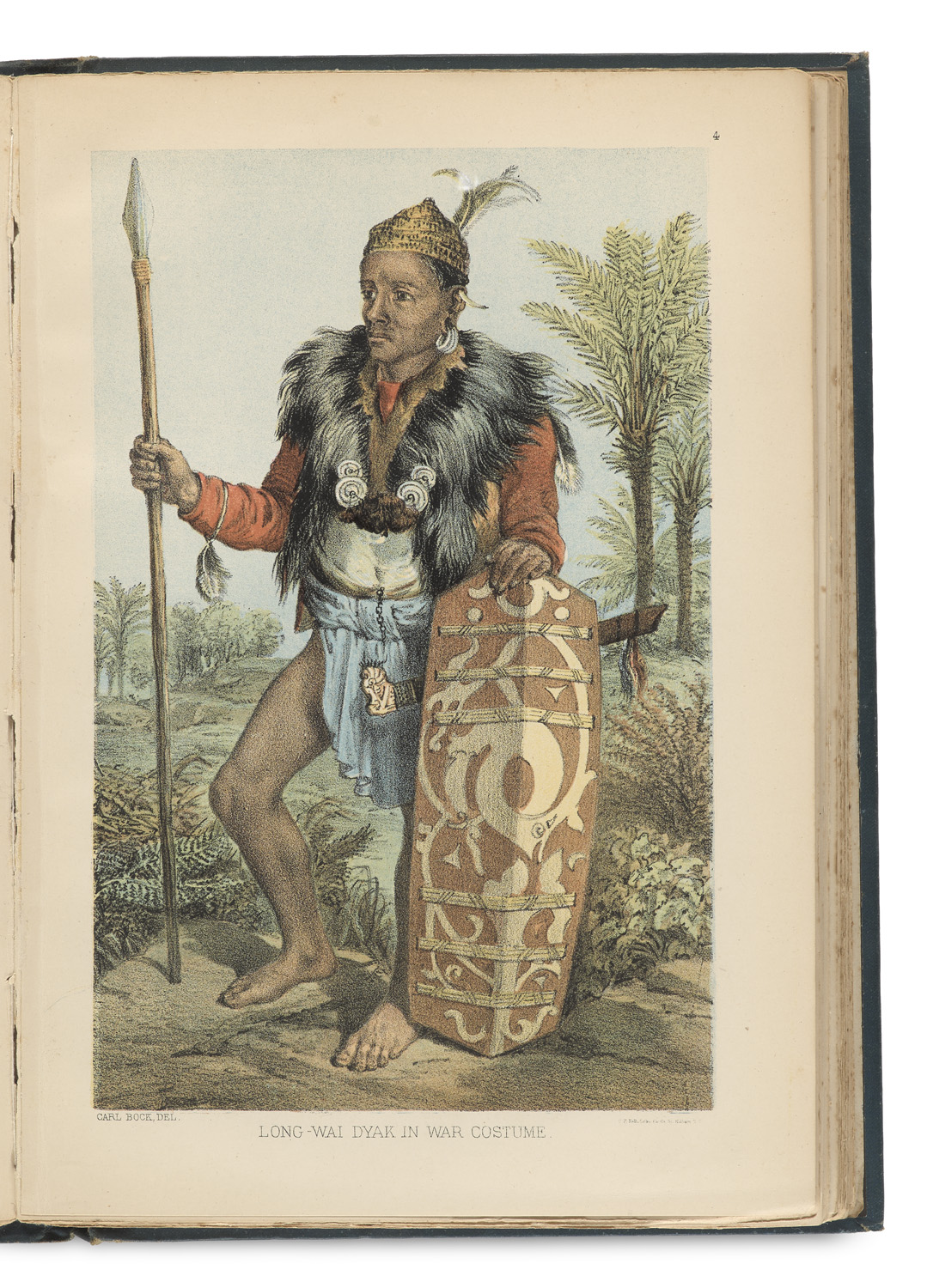 Geography and Travel – Indonesia. - With 30 chromolithographic plates, 1 folded map and further illustrations. Illustrated original canvas with gilt stamped title in transparent cover (rubbed and bumped). - First edition. - Henze I, 280 - With bookplate of the Australian anthropologist Edward Charles Stirling. - Blindstamp by H. C. Bigby. - Carl Bock, a Norwegian naturalist, moved to England in the 1860s for his studies. His research trip to Southeast Asia was financially supported by Lord Arthur Hay. - Margins browned, foxing, some pages and plates loose. Splendidly colored plates