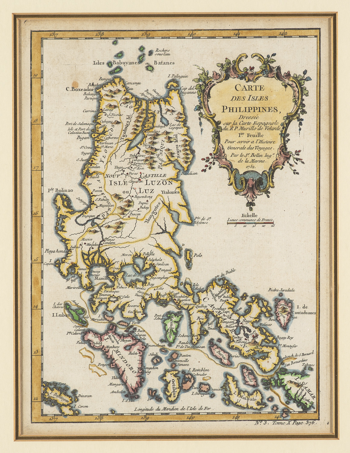 Geographie und Reisen – Der erste Teil von Bellins Karte der Philippinen. - Jacques-Nicolas Bellin (1703-1772) war ein französischer Kartograph und Hydrograph des französischen Königs. Bellin war ein Mitglied der Encyclopédistes, zu denen auch Diderot gehörte. - Ränder leicht gebräunt. Minimal stockfleckig. Insgesamt sehr gut erhaltene Karte, in kräfigem Kolorit.