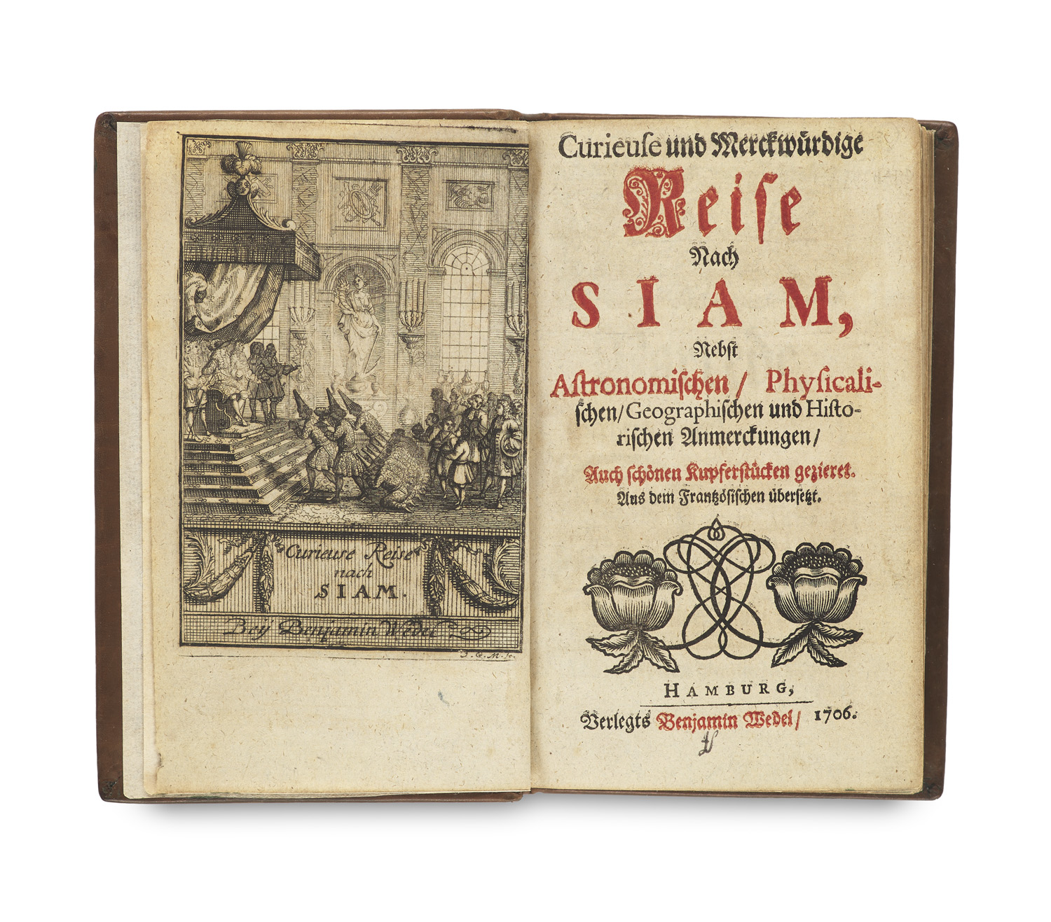 Curieuse und merckwurdige Reise nach Siam, nebst astronomischen, physicalischen, geographischen und historischen Anmerckungen. Aus dem Franzosischen ubersetzt. Mit Kupfertitel und 13 tlw. gefalt. Kupfertafeln. Hamburg, B. Wedel. 1706. Kl.-8vo.3 Bll., 365 S. (Mod.) Lederbd. im Stil d. Zt.