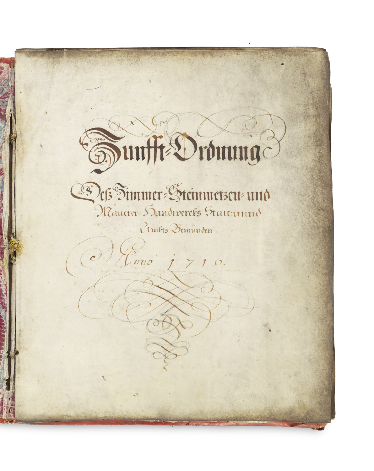 Zunfft-Ordnung Deß Zimmer-Steinmetzen- und Maurer-Handwercks Statt: und Ambts Gemünden. Anno 1710. Deutsche Handschrift auf Pergament. 4 Bll. (je ca. 36 x 31 cm). Rot gefärbtes Pgt. mit Kordelbindung (Schließen fehlen, fleckig u. stark angeschmutzt).