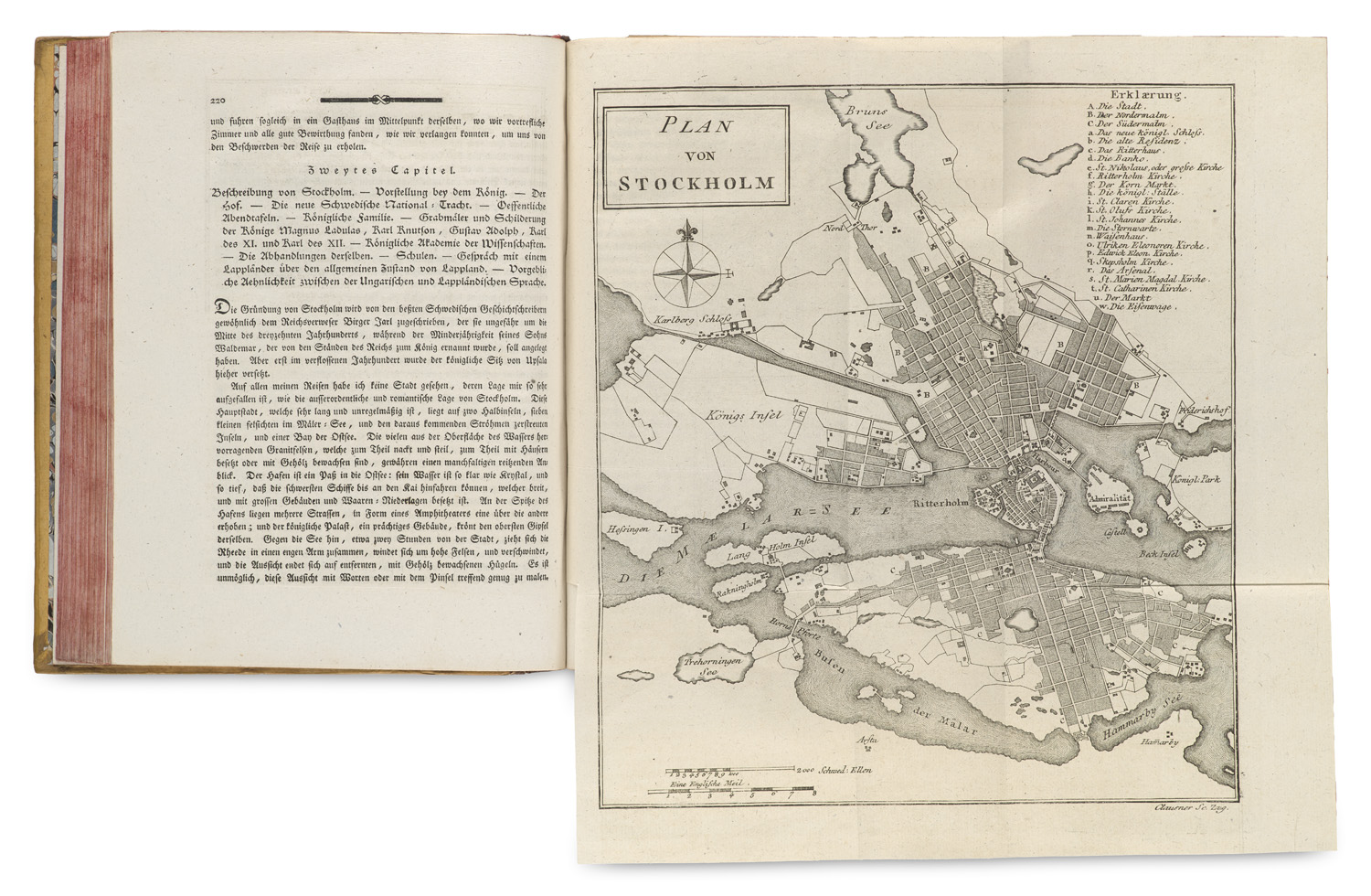 Geography and Travel – 3 vols. Each with a title vignette, 1 folded table and 12 (of which 9 folded) copper plates and maps. Contemp half leather with gilt stamped ribbed boards and color edges (rubbed and bumped, partly slightly stained). - First German edition. - Embacher 86 - Engelmann 252 - Cox 185f. Complete series with the often missing 2nd volume, which describes Coxe's second journey to Scandinavia. - Coxe accompanied English noblemen on their travels and reports very vividly, precisely and critically on the social, political and cultural conditions in the countries he visited. - The translation was carried out by the politically-minded writer Johann Pezzl, who had just been forced to flee Bavaria because of his satirical attacks. - With plans of Moscow, St. Petersburg, Stockholm and Copenhagen, maps of the Caspian Sea, southern Norway and various canals etc.. - Volumes I-II slightly foxed, very well-preserved copies. Pages of the 3rd vol. more heavily browned, plates in good condition. Overall very nice, complete copies.