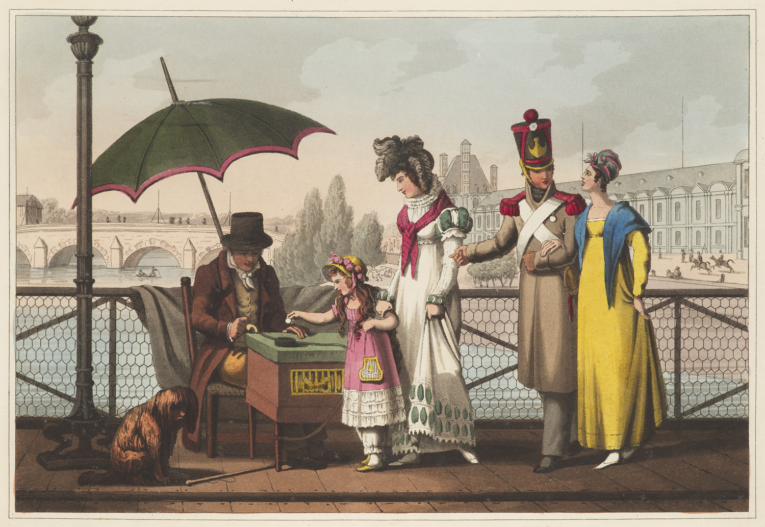 Geography and Travel – France - Paris - With 21 hand-coloured aquatint plates. 19th c. half leather with rich gilt on spine, gilt edges (more heavily rubbed and bumped, capitals with defects). - From the library of Frederick Collins Wilson, Southampton, with his engraved armorial bookplate on the front endpaper. - Second edition. Two plates with watermark 1825, another with 1824 - The colourful plates show scenes from everyday life in the city, such as jugglers, vendors, dancers, wanderers, fishmongers, flower sellers, soldiers, water carriers and wealthy people on the promenade. The first four parts with a total of 16 plates were published in 1822. The fifth part with the remaining five plates followed in 1824. The present edition was published shortly afterwards, with a slightly different title and a newly letterpress printed text. - Somewhat browned. Occasional light foxing or fingerstaining. Overall beautifully preserved with strong colouring.