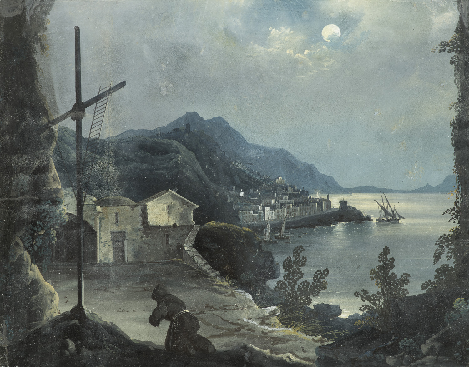 Geographie und Reisen – Nächtliche Szene an der Amalfiküste mit einem knienden Mönch im Vordergrund. Das Mondlichterhellt die Küstenszene und einige Boote liegen vor der Küste im Wasser. Die Stadt liegt am Fuß der Begre und im Hintergrund sind die Umrisse der bergigen Küstenlandschaft zu sehen. - Mit montierter Photographie auf der Rückwand des Rahmens. - Insgesamt prachtvolle Gouache in deckenden, kräftigen Farben.