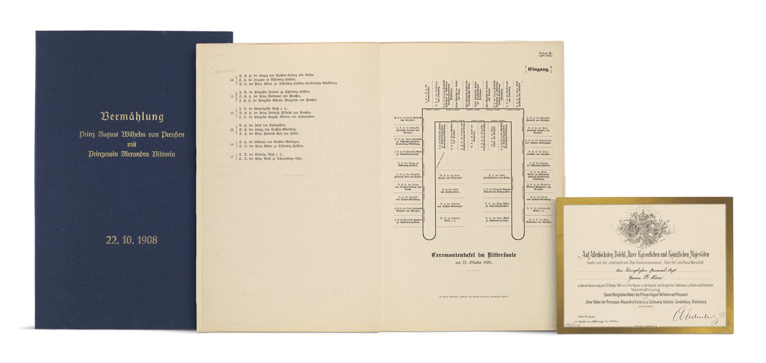 Manuscripts – Collection of an invitation card signed by August zu Eulenburg and 3 printed matters concerning ther marriage of Prince August Wilhelm of Prussia to Princess Alexandra Viktoria. 22 October 1908. Together in later blue cloth portfolio with gilt stamped title. - Contains: Lithogr. invitation card with coat of arms illustration and gold border for the royal general physician Dr Kern (probably Berthold von Kern (1848-1940)). Signed by August zu Eulenburg (1838-1921). - Order of the festivities in the Royal Palace in Berlin. Orig. cardboard with gilt stamped title (front cover loose). - With enclosed double leaf with appendix (seating plan). - 'Hof-Ansage' with instructions for all the events planned for 21 and 22 Oct. - 'Court announcement' on the distribution of the guests invited to the banqueting table to the various rooms of the castle. - In add.: 'Hof-Ansage' with an invitation issued by the Chief Master of Ceremonies Count A. Eulenburg to a divine service on the occasion of the emperor's birthday' on 27 Jan. 1909. - Order of the service in the ... Castle Chapel on 27 January 1909. - Speech of the Emperor. - Margins partially dusty, 2 leaves with foldmarks, 1 handwr. note, overall well preserved.