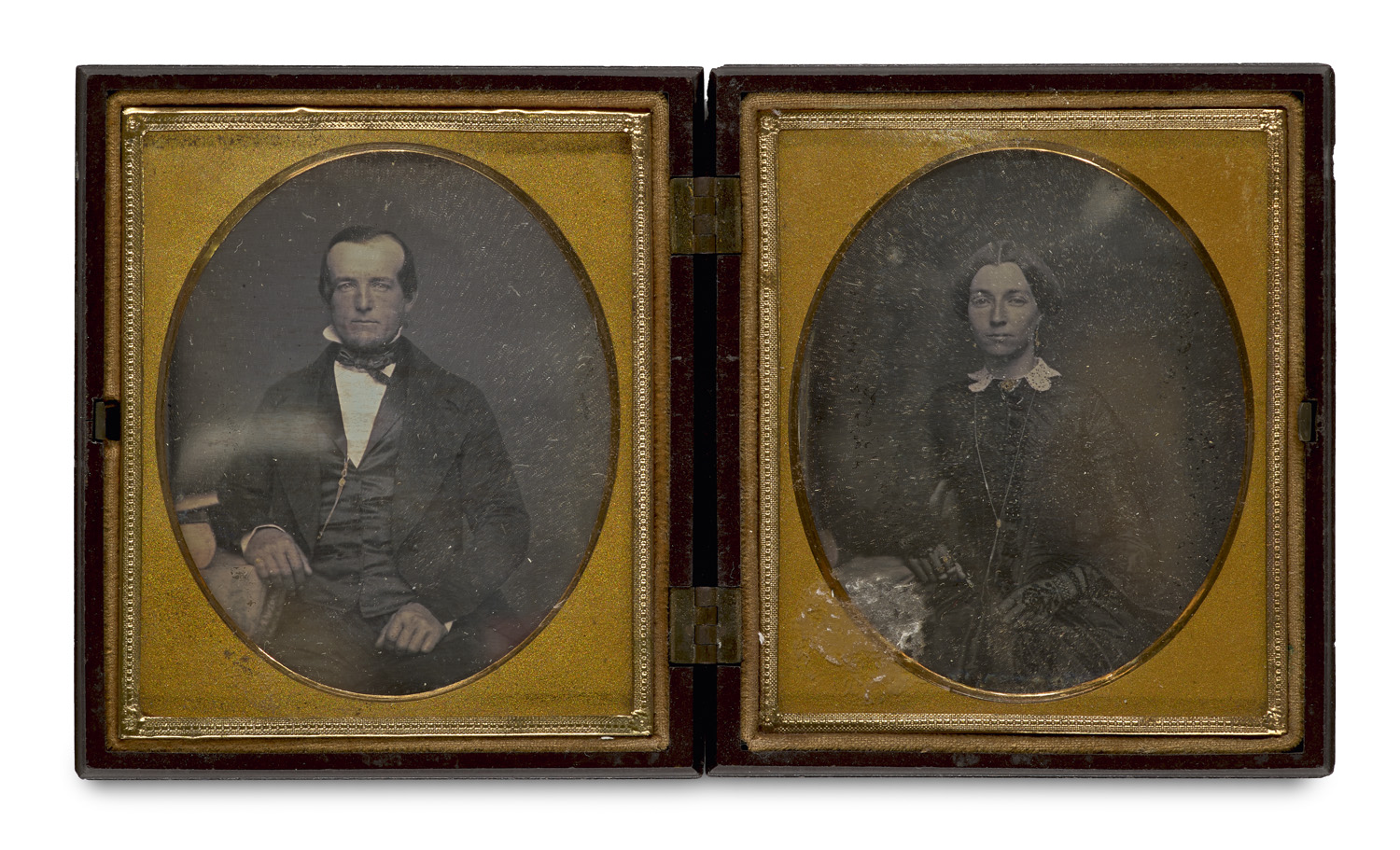 Photography – Daguerreotype. - Collection of six early daguerrotypes with portraits. Around 1860. Each decoratively framed under glass (unopened), some with decorative borders. - Includes a portrait of a married couple, on two plates and framed as a diptych. Also three male portraits and that of a young child. The portraits were probably all originally framed in two-part hinged frames. Only those of the couple and the child are still intact and complete. These each elaborately decorated with rich blind embossing on covers. - Oxidized in the margins. Partly spotted.