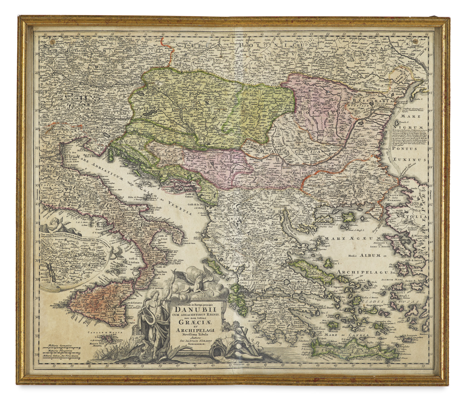 Fluviorum in Europa principis Danubii cum Adiacentibus regnis, nec non totius Graeciae et Archipelagi. Kupferstichkarte. Nürnberg, (um 1720). 49 x 59. Unter Glas gerahmt und montiert.