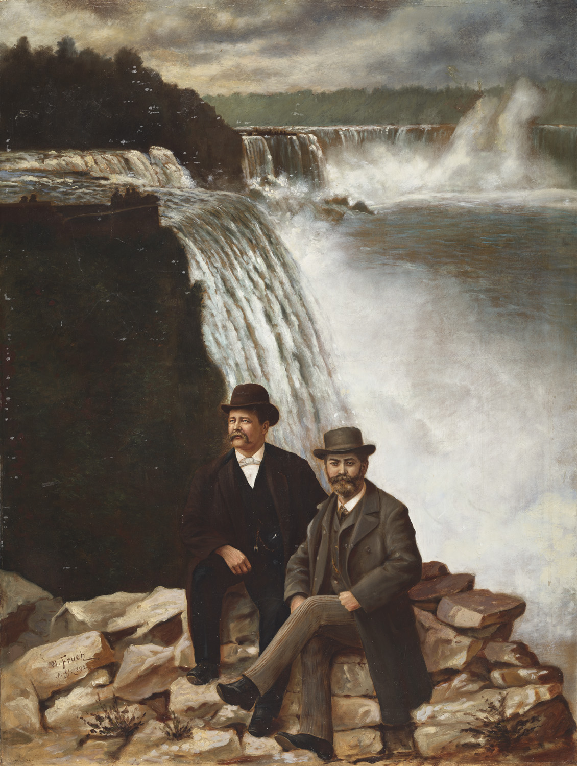 Doppelportrait vor den Niagarafällen. 1892. Öl auf Leinwand. 101,5 x 76,5 cm. Signiert, datiert und ortsbezeichnet. In Schattenfugenleiste gerahmt.