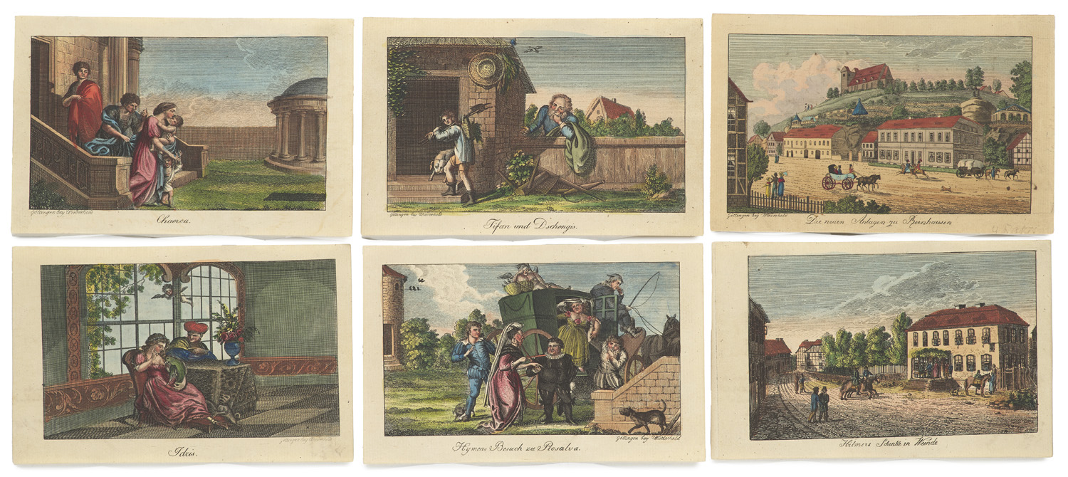 Manuscripts – Liber amicorum with 47 leaves each with engraving (20 col.) and 38 entries for the later physician Christian Friedrich Karl Heinrich Schmeißer in Siegen. Around 1824-1839. Loose sheets mostly by Wiederhold in Göttingen with three gilt edges. In oblong contemp. half leather case with gilt fillets and gilt embossed title 'Der Freundschaf(t) geweiht' partly rubbed). - Schmeißer (1809 Daaden - 1879 Siegen) studied medicine in Giessen and Berlin and became a Doctor in Siegen in 1836. - With entries by friends, classmates and 'house mates', among others, as listed above. - The engravings show, partly colourfully illustrated, among others: Hymen's visit to Rosalva, Chaerea, Tifan and Dschnegis, Idris as well as views as listed above, and many more. - Altogether well preserved.