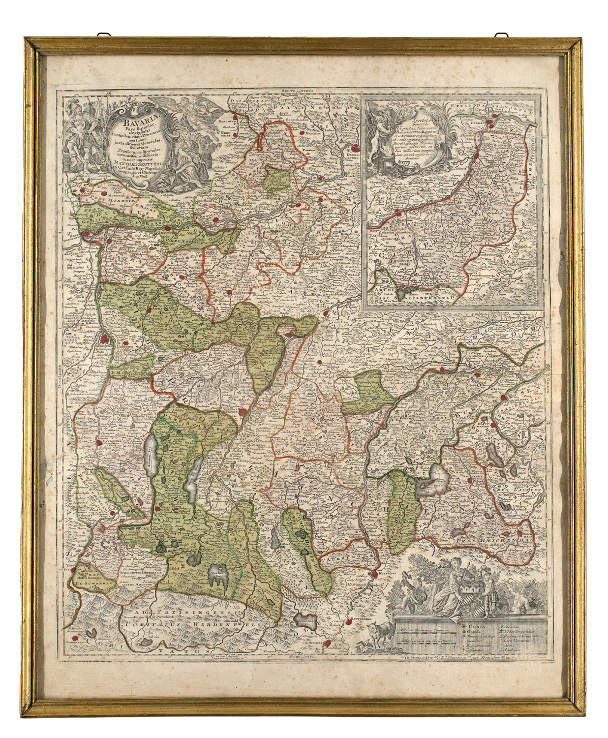 Bavariae. Pars superior, designatis Confinibus etiam Provinciis non solum juxta ditiones Generales, sed etiam Praefecturas Speciales accuratissime distincta. Augsburg, nach 1741. Altkolorierter Kupferstich. Plattenmaße ca. 57 x 50 cm. Dekorativ unter Glas gerahmt (ungeöffnet).