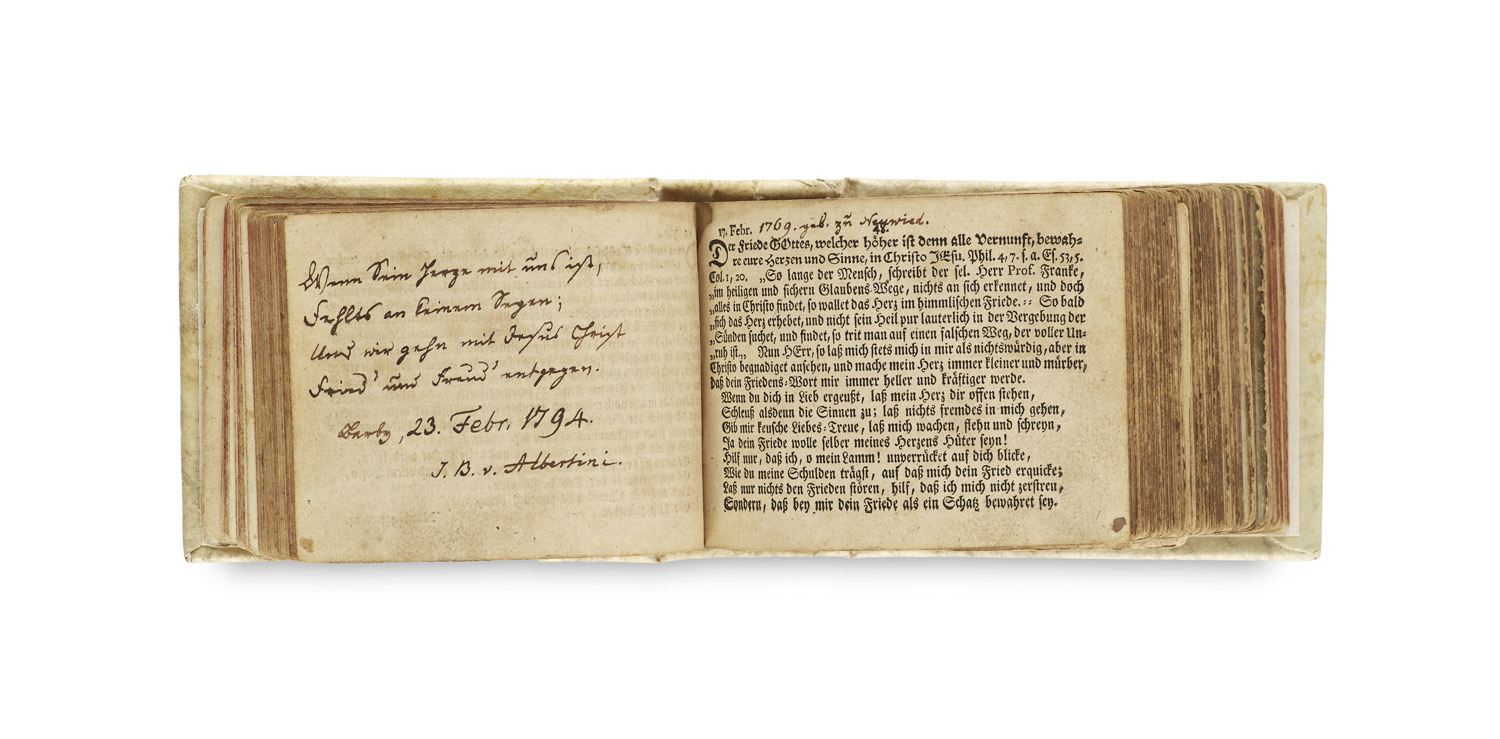 Manuskripte und Urkunden – Barby war in der zweiten Hälfte des 18. Jh. (1749-1809) Sitz der evangelischen Brüdergemeine (Herrnhuter Brüder-Unität) und der weltweiten Mission der Herrnhuter. 1749 wurde das "Seminarum Theologicum" (Predigerseminar) der Brüdergemeine vom hessischen Lindheim nach Barby verlegt, wo es im Schloss unterkam, das Graf Heinrich XXVI. von Reuß vom Kurfürstentum Sachsen gepachtet hatte, um es Graf Nikolaus Ludwig von Zinzendorf für die Brügergemeine zu überlassen. Einer der berühmtesten Schüler des Seminars war von 1785-1787 Friedrich Schleiermacher. Nach Auslauf der Pacht 1808 verlegte die Brüdergemeine ihre Einrichtung nach Gnadau. - Mit Einträgen (verso auf den einseitig bedruckten Textseiten) meist aus Barby, außerdem Neuwied, Niesky, Berlin, Amsterdam, Christianfeld, Gnadenfrey u.a. von Johann Baptist von Albertini (1769-1831, Bischof u. Liederdichter, Botaniker u. Mykologe), Emanuel Bager (1788-1866), Jacob Ulrich Sprecher von Bernegg (1765-1841, schweizer. Politiker), Hermann Johann von Campenhausen (1773-1836, livländ. Landespolitiker), Peter Friedrich Curie (1777-1855, Theologe u. Bischof), Joh. Chr. von Damnitz (1747-1818), Ernst von Gersdorff (1781-1852, Staatsminister, Diplomat), Christian Gregor (1723-1801), Johann Jänicke (1748-1827, Prediger, Gründer der 1. Missionsschule in Dtl.), Nikolaus Kramer (1780-1844), Gottlob Martin Schneider (1763-1849), Anton von Strampf (1754-1822), u.v.m., sowie von Mitgliedern der Ebenisten-Familie Roentgen (Neuwied), darunter August Roentgen, Henriette Roentgen (geb. Stobwasser) und deren Ehemann Ph. Jac. Roentgen. - Vorsatz mit spät. Monogrammstempel u. Erbvermerk, papierbedingt gebräunt, etw. fingerfleckig, sonst gut erhalten.