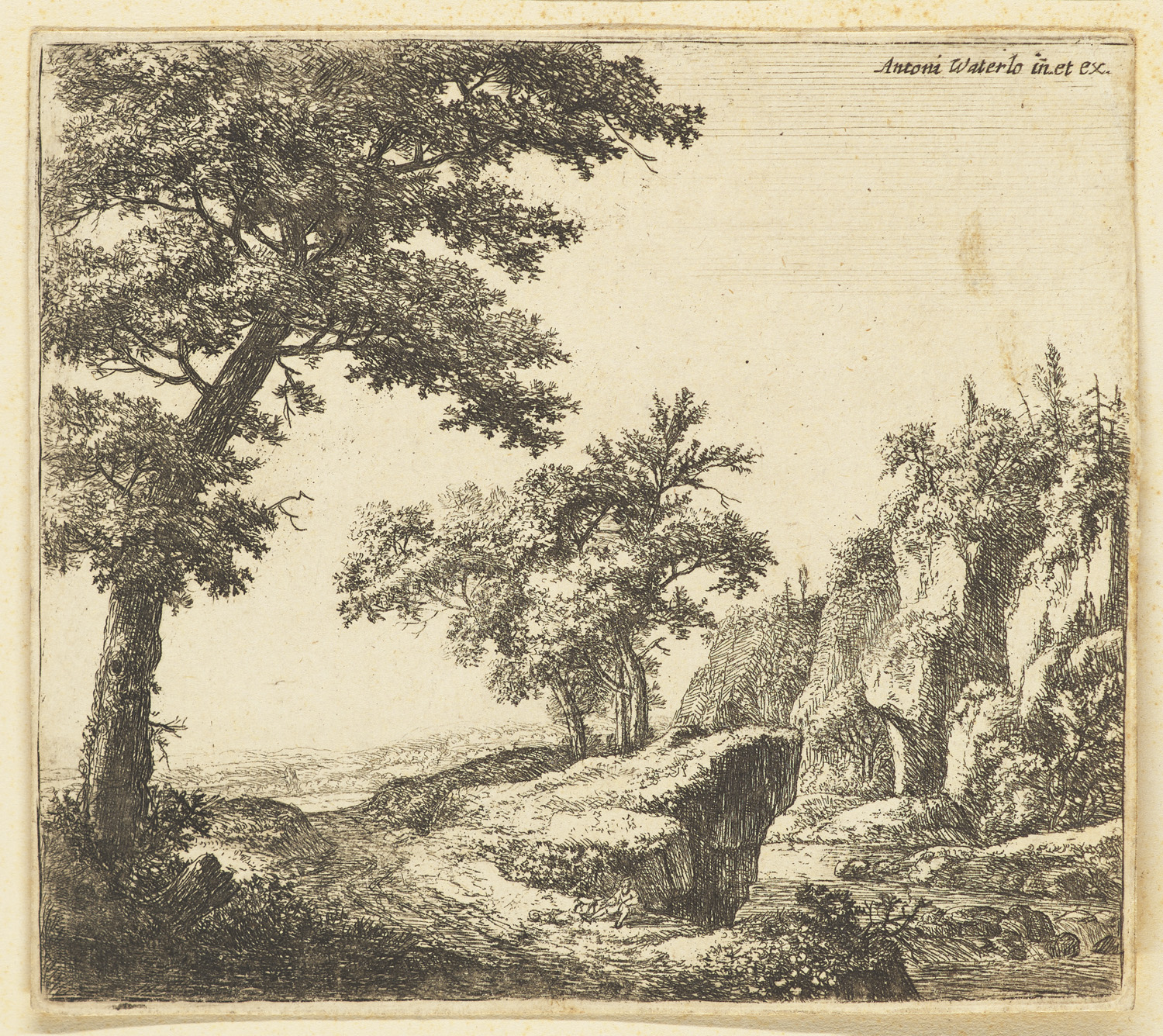 Old Master Prints – Collection of two etchings. Etchings on laid paper. Mounted on paper under a passe-partout. Each signed in the plate. - Contains the two etchings "Three Boys with a Dog" and "River Along a Rock Face" by the Dutch painter and etcher Anthonie Waterloo. His etchings mostly depict landscapes with trees, some of which include genre scenes. - Trimmed to the platemark. Minimal staining. Overall, these are magnificent, detailed, and well-preserved etchings. - Included: two pen-and-ink drawings of landscape motifs. Mounted on paper with a passe-partout. - Heavily trimmed. Slightly stained. Overall, well-preserved.