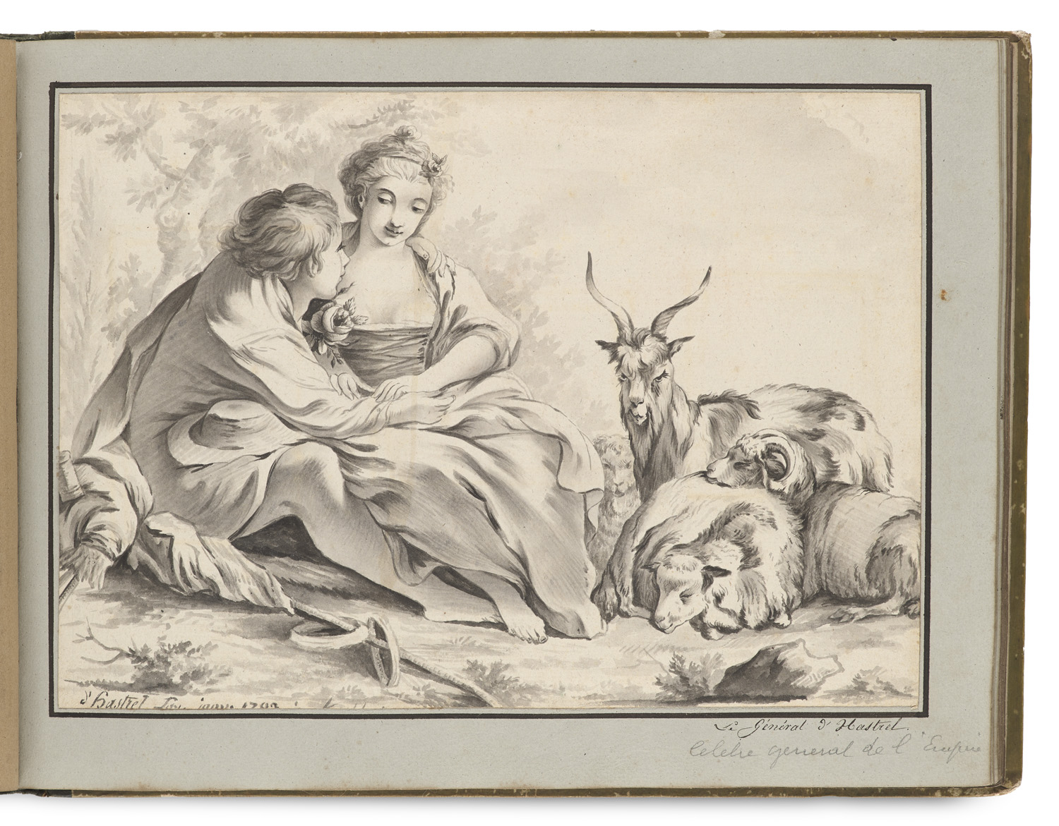 Gemälde, Zeichnungen u. Grafiken 16. bis 19. Jhd. – Enthält Landschaftsansichten, Genredarstellungen, botanische und zoologische Zeichnungen, Porträts, Stillleben u.a. in tls. skizzenhafter Erfassung. - Im Album je mit eingezeichneter Rahmung in brauner Tinte sowie hs. Bezeichnung einer Hand vermutl. als Hinweis auf den Verfasser der jeweiligen Zeichnung. Genannt werden: J.B. Meunier (wohl Jean Baptiste Meunier), Arthur de Feltre, Henriette de Fezensac, Edgar de Feltre, Alphonse de Feltre, Adolphe d'Hastrel, Le Comte de Hédouville. Richard de Querelles, Le Général d'Hastrel, Marquis de Vogüe (Melchior de Vogüé (?)), Léopold de Pérignon, u.a. - Albumseiten alters- u. papierbedingt gebräunt, tls. leicht stockfleckig (Zeichnungen partiell betroffen), technikbedingt leicht gewellt, teils mit Abklatsch, einige Bll. mit Papierfraß (bedingt durch Leimung), diese tls. hinterlegt, tls. mit Tintenfraß. Insgesamt gut erhalten.