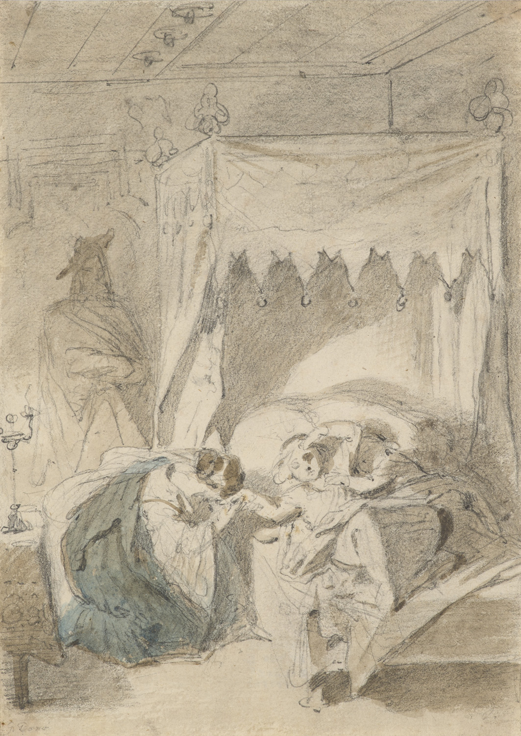 Paintings, drawings and prints 16th to 19th century – Theatrical scene. Watercolour over pencil on laid paper. With artist's name "G. Doré" by another hand in the lower left corner. On verso with stamp of the "Sammlung Justinus Kerner" and annotations in pencil by an another hand. - Dramatic scene, captured in detailed and shadowy lines, reminiscent of the style of Gustave Doré (inscription bottom left). Here we see a mother at the bedside of her child, holding his hand with her head bowed, expressing this moment of pain and hopelessness in a poignant way. - Occasional minor brownstaining. Verso in upper margin with traces of old mounting. Good overall.