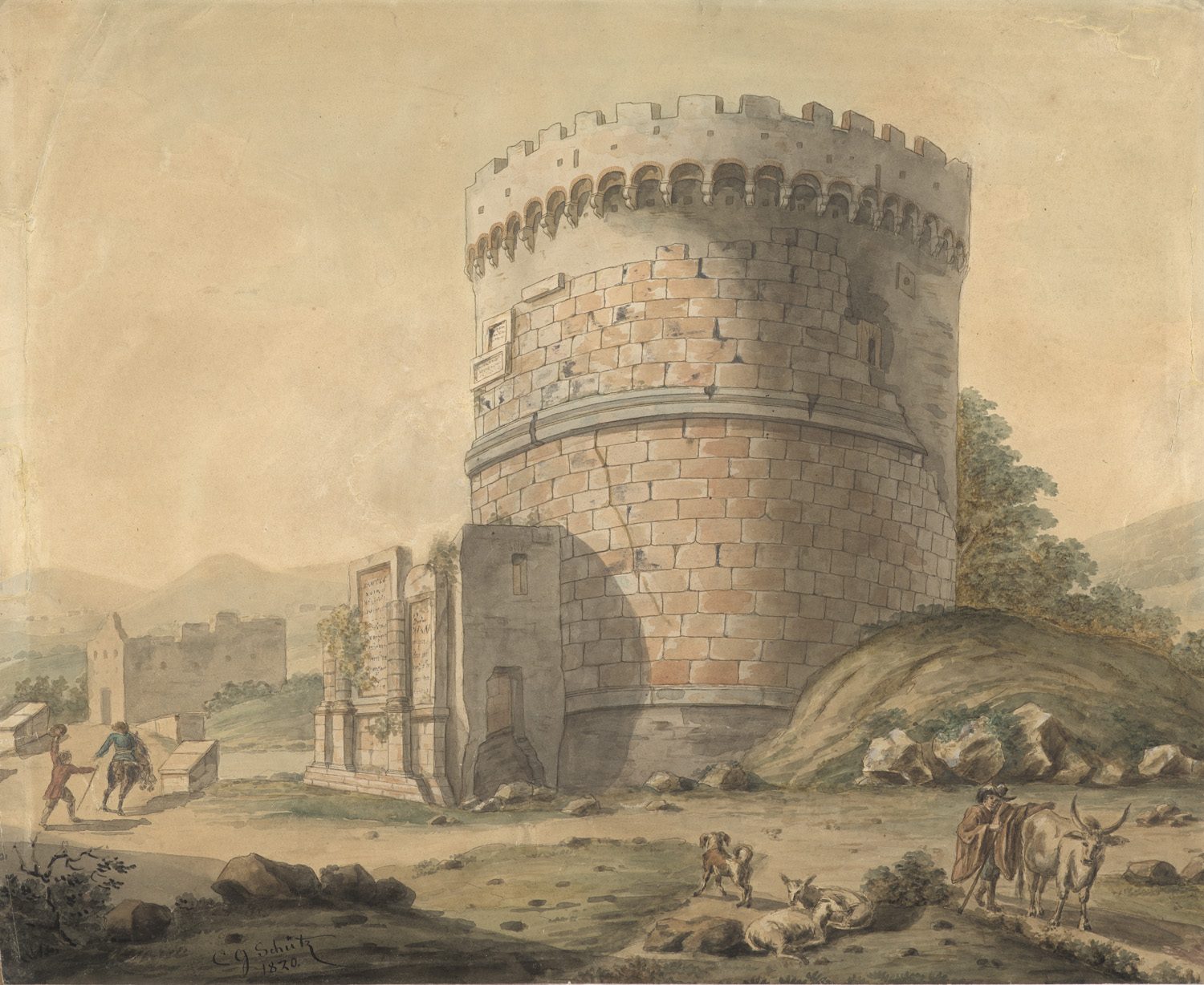 Paintings, drawings and prints 16th to 19th century – Watercolour on brownish paper. Signed and dated. Spot mounted on backing and under passepartout. - Paper somewhat wavy due to the technique. At margins with some tears, these backed or restored, motif not affected. With traces of studio on verso. - Grandson of Christian Georg Schütz of the same name, Schütz the Younger died at the age of 20 and left behind only a small oeuvre. He was considered very talented. - The tomb of Caecilia Metella, an imposing funerary monument on the Via Appia Antica in Rome, is shown in front of a background decorated with staffage figures in the foreground. The tomb was depicted by a number of artists at the time, for example Hohann Heinrich Wilhelm Tischbein in the background of his painting "Goethe in der Campagna". - Delicately browned due to the paper (partly somewhat irregular), slightly wavy due to the technique, some tears in the margins, these partly backed or restored, verso with surrounding backing and somewhat stained. Overall good. Delicate and detailed watercolour study by the artist.