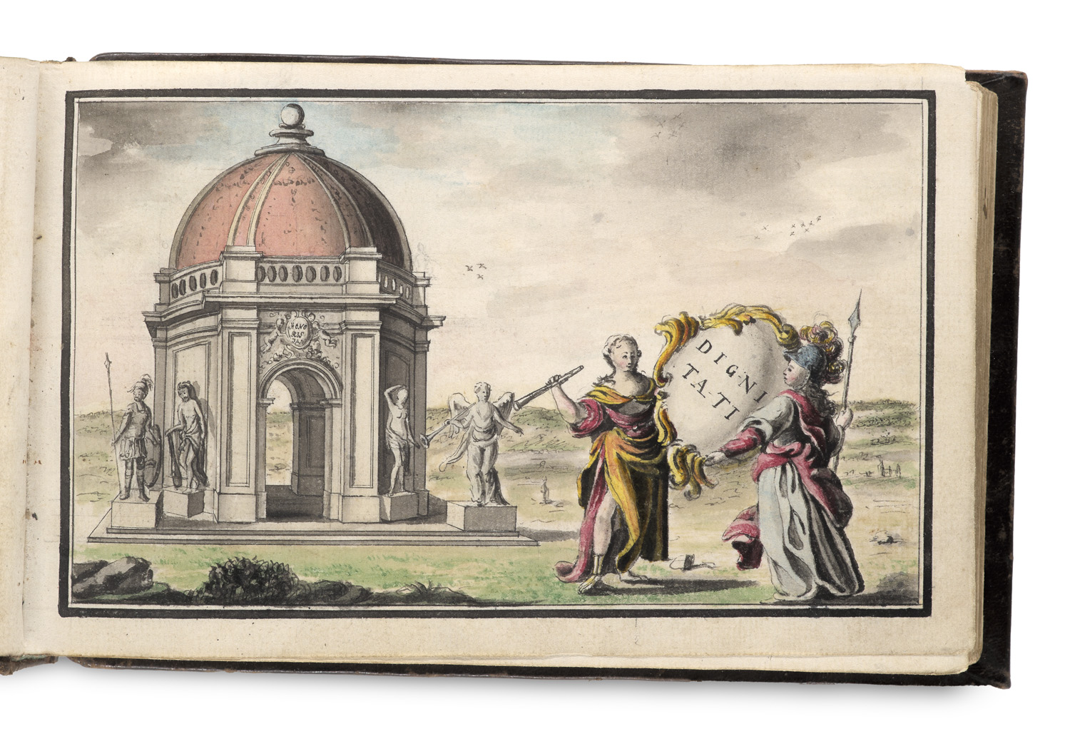 Stammbuch des Samuel Daniel Lischoviny, Medizinstudent in Wien. Mit 45 Einträgen, 1 Bleistift- und 2 Federzeichnungen sowie 6 Aquarellen. Wien, Pressburg, Neusohl u.a., 1765-1772. Ca. 250 Bll. Bütten mit Wz. (ca. 12 x 19 cm), darunter zahlr. blanko. Quer-8°. Ldr. d. Zt. auf 4 Bünden mit dreis. Goldschnitt, Rückenverg. u. goldgepr. DFileten mit goldgepr. Bordüre, in blindgepr., 2-teiligen Ldr.-Schuber d. Zt. (je gering berieben u. bestoßen).