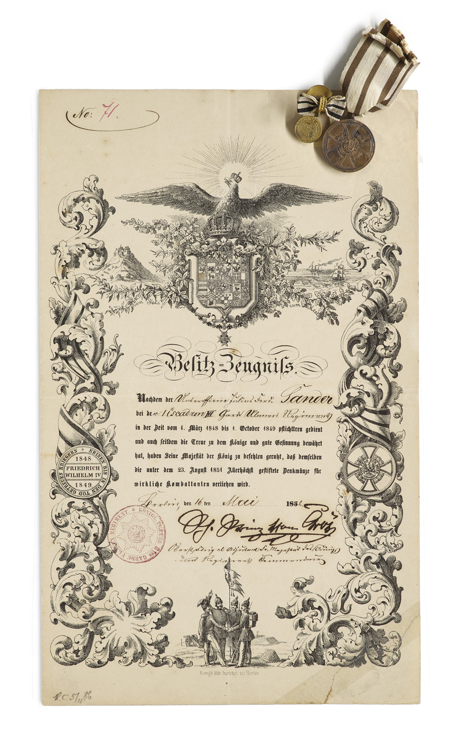 Besitz-Zeugnis der Hohenzollernschen Denkmünze für Kämpfer von 1848/49 für den Unteroffizier Julius Ferd. Sander, dem die "am 23. August 1851 Allerhöchst gestiftete Denkmünze für wirkliche Kombattanten verliehen wird". Illustr. lithogr. Urkunde mit Wappen, Rankenwerk u. Figurenstaffage sowie eigenhändiger Unterschrift von Wilhelm Prinz von Preußen (spät. Wilhelm I.) mit Hohenzollern Denkmünze und Medaille. Berlin, 16. Mai 1852. Ca. 34 x 21 cm. Mit Regimentsstempel.