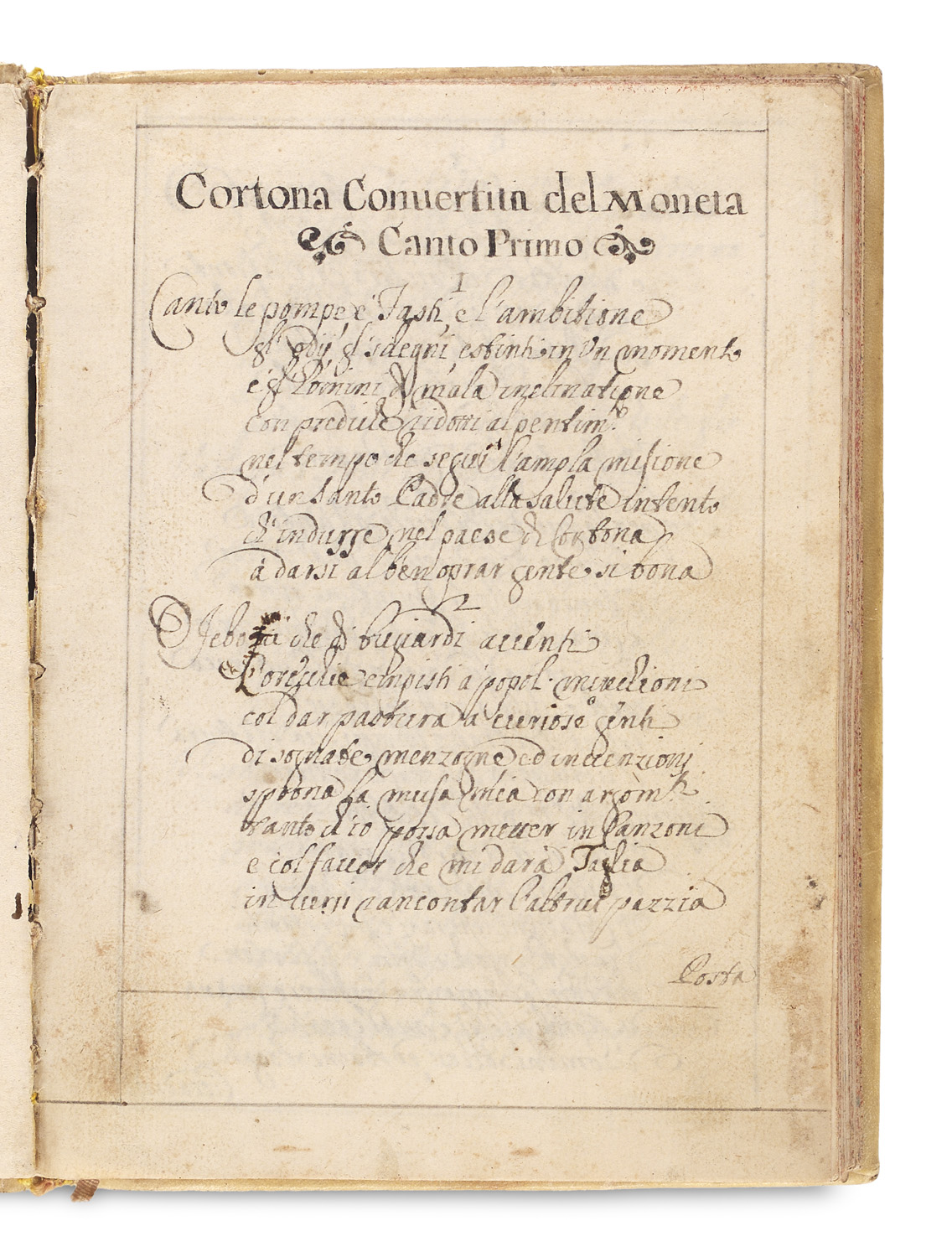 Cortona convertita del moneta. Italienische Handschrift in Versen. O. O., o.J. (um 1700). 56, wovon 54 beidseitig mit schwarzer Tinte kalligraphierte, zusätzlich mit einer Illustration (54v) und vereinzelt mit Arabesken versehene Bll., der Textspiegel eingefasst mit einfacher Linie. Kl.-8° (17 x 12,5 cm). Pgmt. der Zeit über Karton mit goldgeprägtem Rückentitel und durchgehend gesprenkeltem Schnitt.