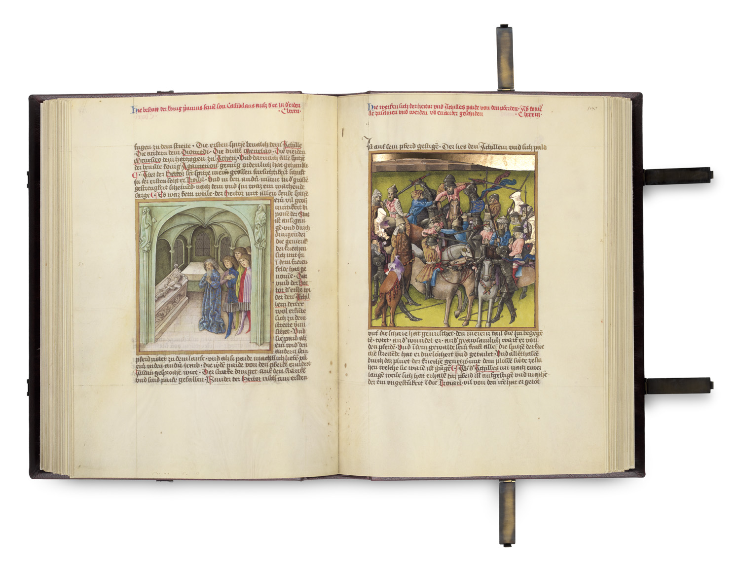 Books on Books - Facsimile Editions – Blind embossed red cloth with fillets and floral elements with clasps with accompanying plexiglass cassette. - One of numbered 998 copies. - In the original cardboard box. - This 15th century manuscript with its rich decorations and illuminations is based on the German translation of the Latin epic by the Sicilian poet Guido de Columnis. The 334 miniatures lend the mythological tale a late medieval courtly atmosphere. - Freshly printed copy with matching unopened box.