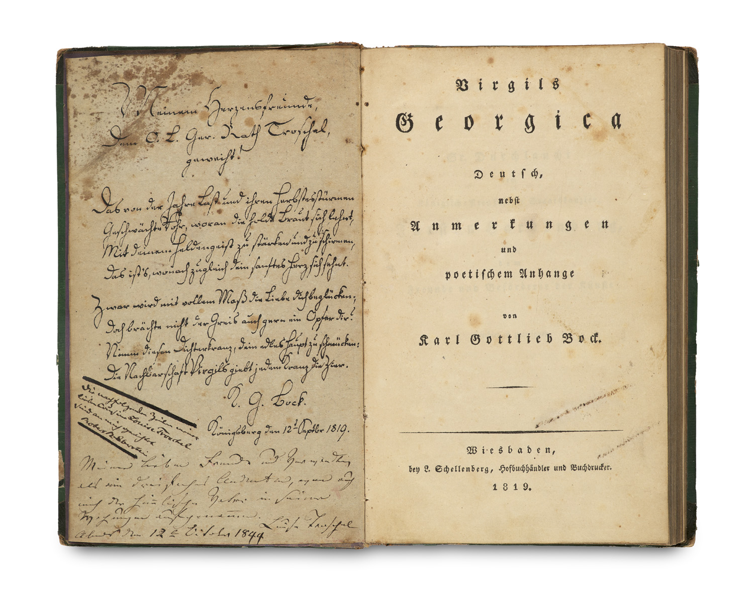 Virgils Georgica. Deutsch, nebst Anmerkungen und poetischem Anhange. Mit eh. Widmung u. eh. sign. Gedicht von Karl Gottlieb Bock. Wiesbaden, L. Schellenberg, 1819. 292 S. 8°. HLdr. d. Zt. mit goldgepr. RTitel u. reicher RVerg. (berieben, bestoßen, etw. fleckig).