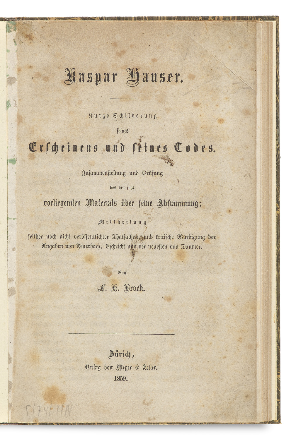 Kaspar Hauser. Kurze Schilderung seines Erscheinens und seines Todes, Zusammenstellung und Prüfung des bis jetzt vorliegenden Materials über seine Abstammung, Mittheilung seither noch nicht veröffentlichter Thatsachen, und kritische Würdigung der Angaben von Feuerbach. Zürich, Meyer & Zeller, 1859. 88 Seiten. 8°. (Mod.) Pp. mit RSchild (Beigelegt alter Zeitungsausschnit " Kaspar Hauser in Pilsach").