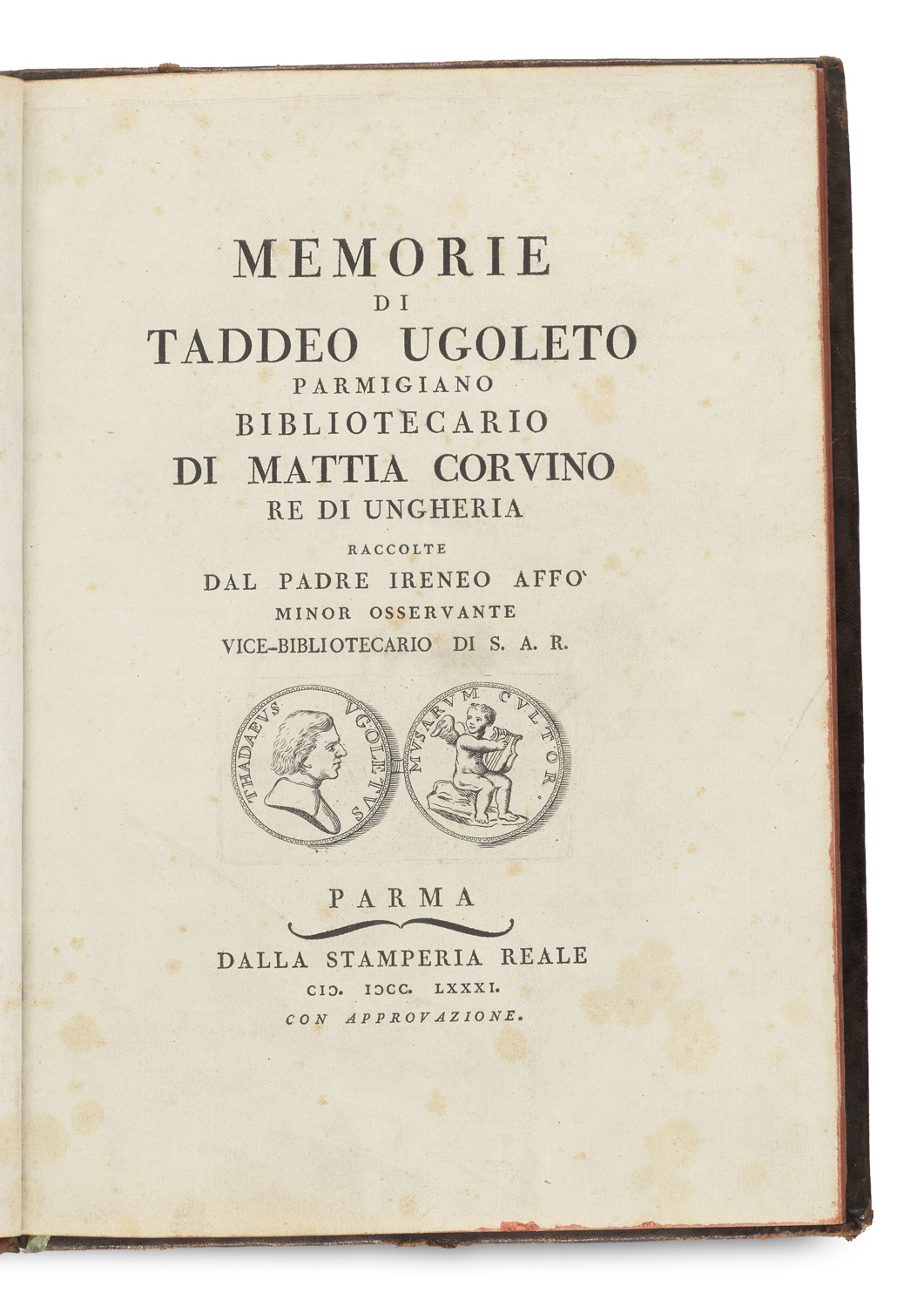 Memorie di Taddeo Ugoleto Parmigiano, bibliotecario di Mattia Corvino re d'Ungaria. Mit gestoch. Titelvign. Parma, Stamperia Reale, 1781. 5 Bl. (1 w. m. hs. Besitzername, Titelbl., gedr. Widm.), 76 S., 1 nn. Bl. (w.) 4°. Gesprenk. u. geglätt. Ldr. d. Zt. mit ornament. goldgepr. RTit., teils auf Lederschildchen, blindgepr. DFileten, Bundpapiervors., dreiseit. Farbschnitt u. Lesezeichenband (kleine Fehlstellen an der unteren Kapitale u. am Hinterdeckel, an den Ecken und Kanten etwas berieben und bestoßen.)