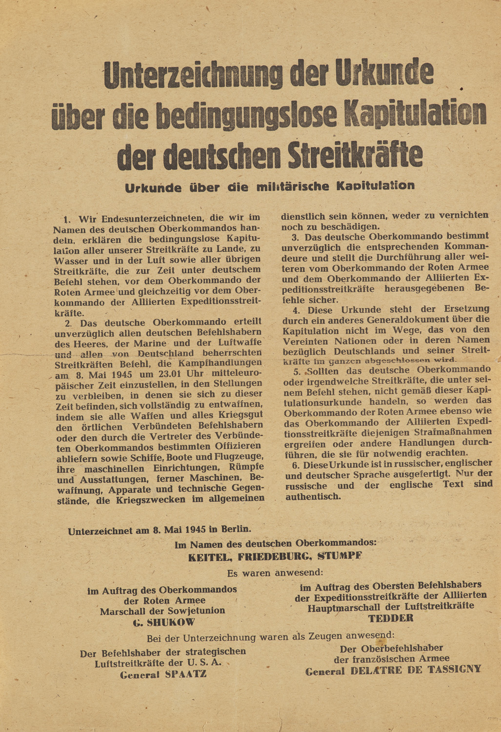 History – Signing of the document of unconditional surrender of the German armed forces. May 1945. Single-sided sheet. - Important leaflet marking the end of World War II. - With smoothed centerfold, with a tear there. Minor marginal wear. Verso with handwritten annotations in colored pencil.