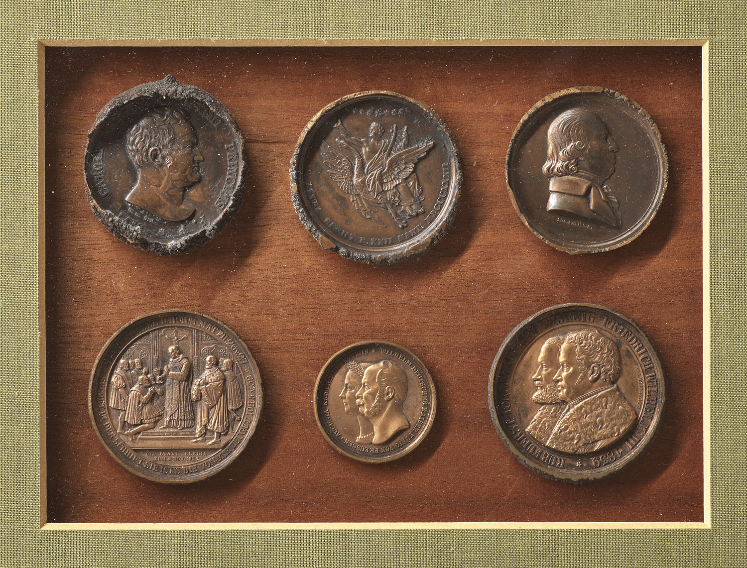 Sammlung von 6 einseitigen Bronzeabschlägen von historischen Medaillen. In tls. goldfarbenen Schaurahmen (25 x 31 cm) auf Holz u. freistehend unter Passepartout montiert.