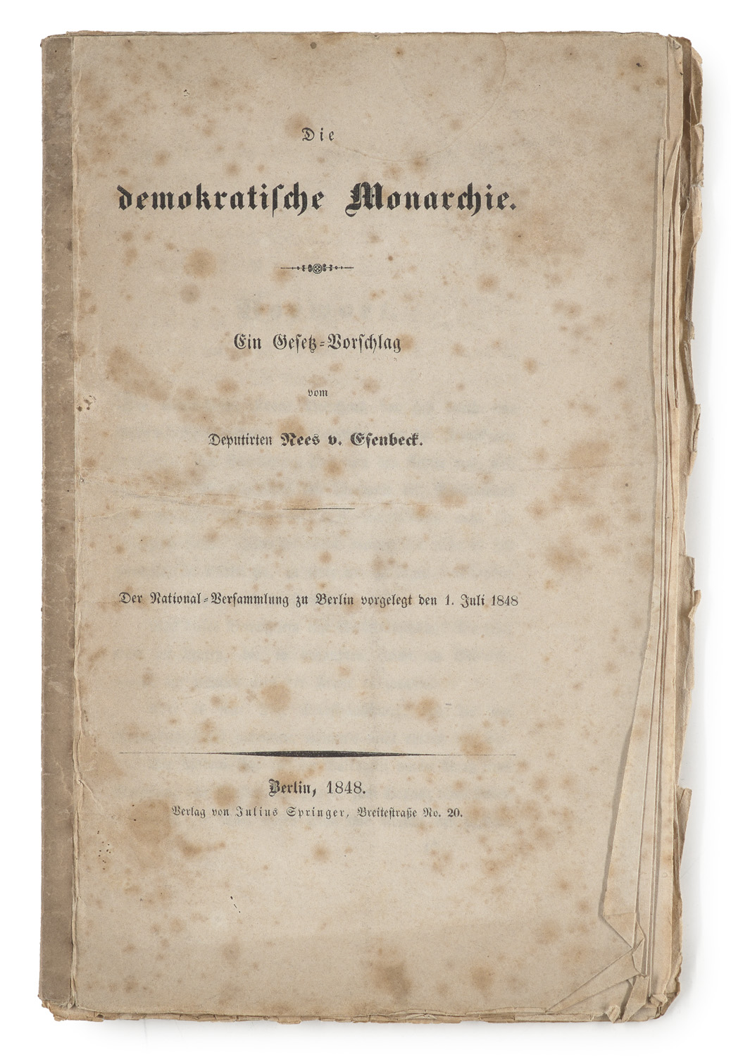 Die demokratische Monarchie. Ein Gesetz-Vorschlag. Der National-Versammlung zu Berlin vorgelegt den 1. Juli 1848. Berlin, Julius Springer, 1848. 26 S. 8°. OBroschur (stock- und wasserfleckig, Randläsuren).