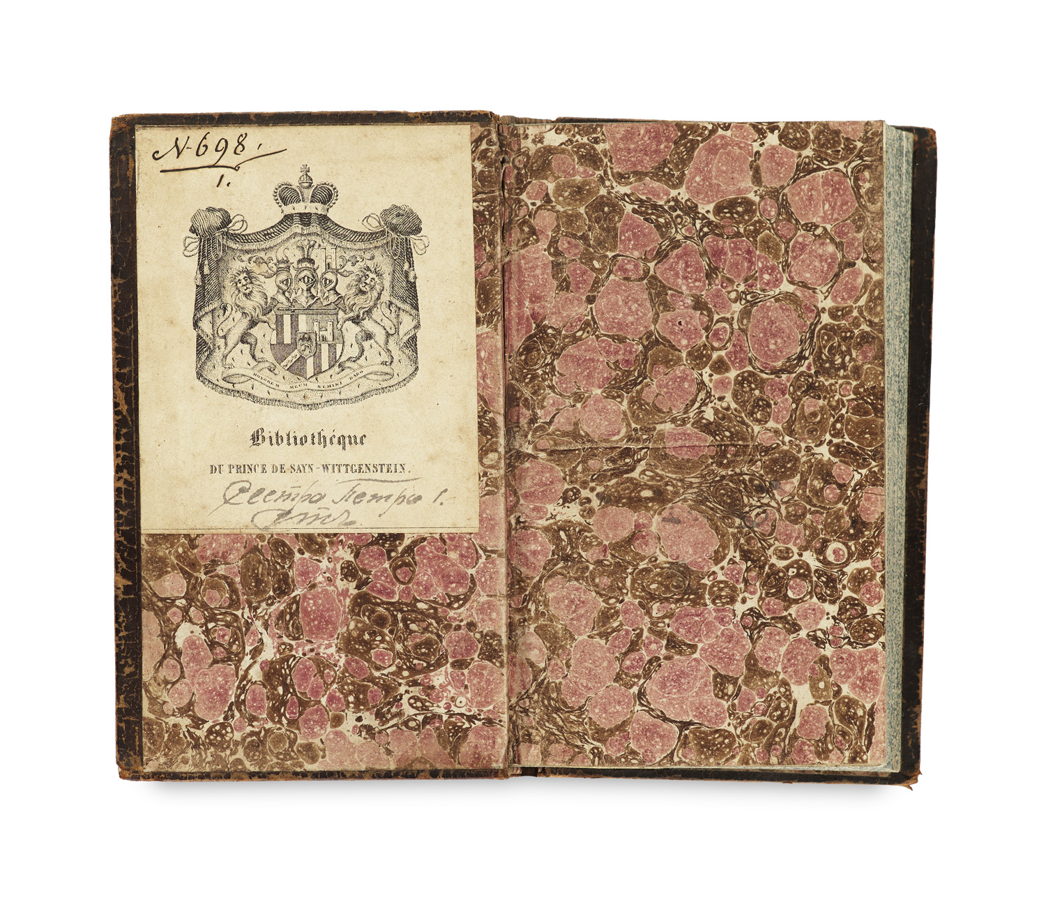 History – Enlarged edition of this classic work on diplomacy, our copy with highly prominent noble provenance. - NBG VIII, 211 (for the author). - The first edition of the work written by François de Callières (1645-1717), diplomat, statesman and writer in the service of Louis XIV, was published by Brunet in Paris in 1716. - Provenance: 1st Princes of Sayn-Wittgenstein, with their family coat of arms as an engraved ex libris and handwritten library siglum on both front endpapers. A branch of the Sayn-Wittgenstein family lived in Russia since the 1760s. 2. Georgiy Nikolayevic Mombelli, each with dedications to 3. Natalya Alexandrovna Baronessa Wenckstern and 4. his son Vasily Grigorievic Mombelli. - First and last leaves with minor foxing, otherwise well-preserved copy with wide margins.