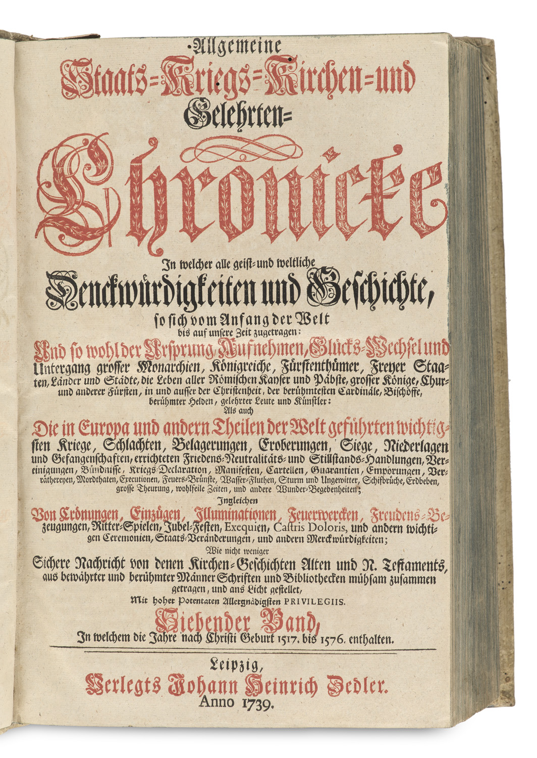 Allgemeine Staats- Kriegs- Kirchen und Gelehrten-Chronicke. In welcher alle geist- und weltliche Denckwürdigkeiten und Geschichte, so sich vom Anfange der Welt bis auf unsere Zeit zugetragen. Bd. 7 (von 20). Mit 2 gest. Textkupfern. Leipzig, Johann Heinrich Zedler, 1739. 9 Bll., 1012 S., 15 Bll. Folio. Blindgepr. Schweinslederbnd auf Holzdeckeln mit RSchild.
