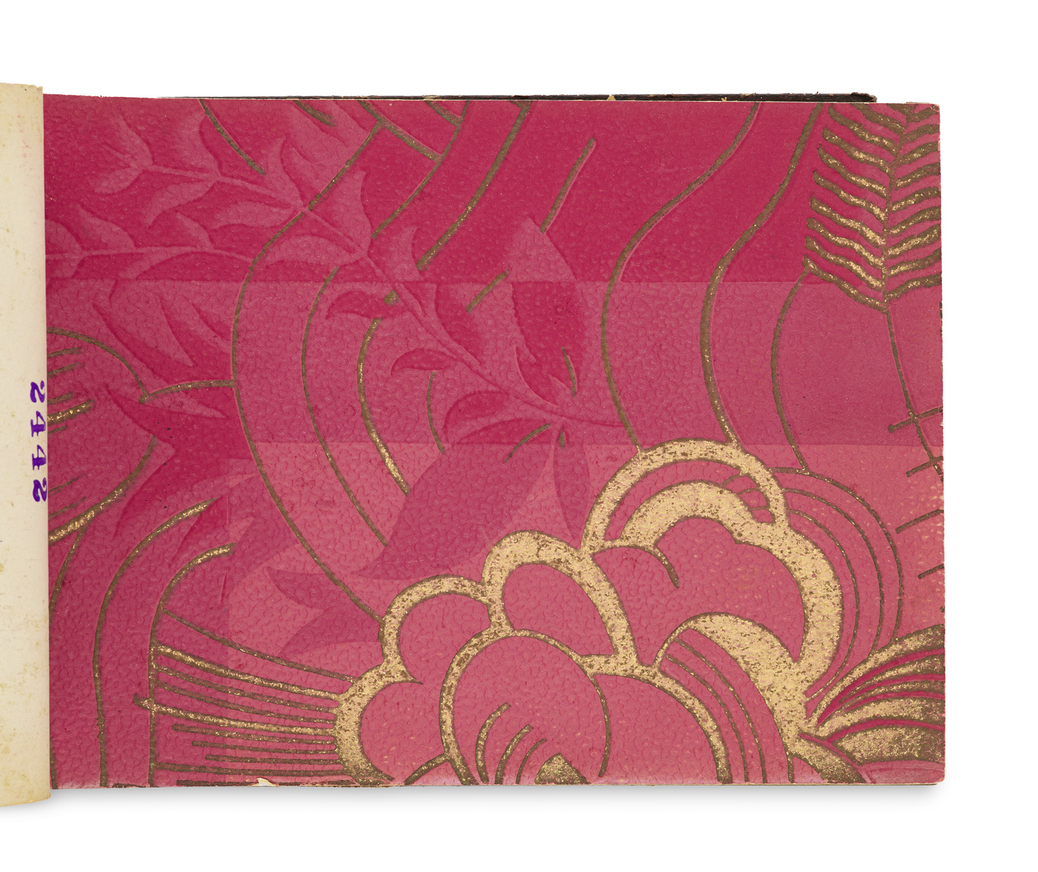 Modern Literature and Art – Catalogue "Dernières Nouveautés" with approximately 170 pochoir prints for Art Deco wallpapers. Orig. half cloth, screw-bound (rubbed, bumped, stained). - Partly gold and silver coloured, partly on embossed and glossy paper. - Verso mostly stamped (numbering, address stamp, indication of lightfastness, etc.). - Some sheets removed, partially browned due to paper and slightly foxed, otherwise overall good condition.