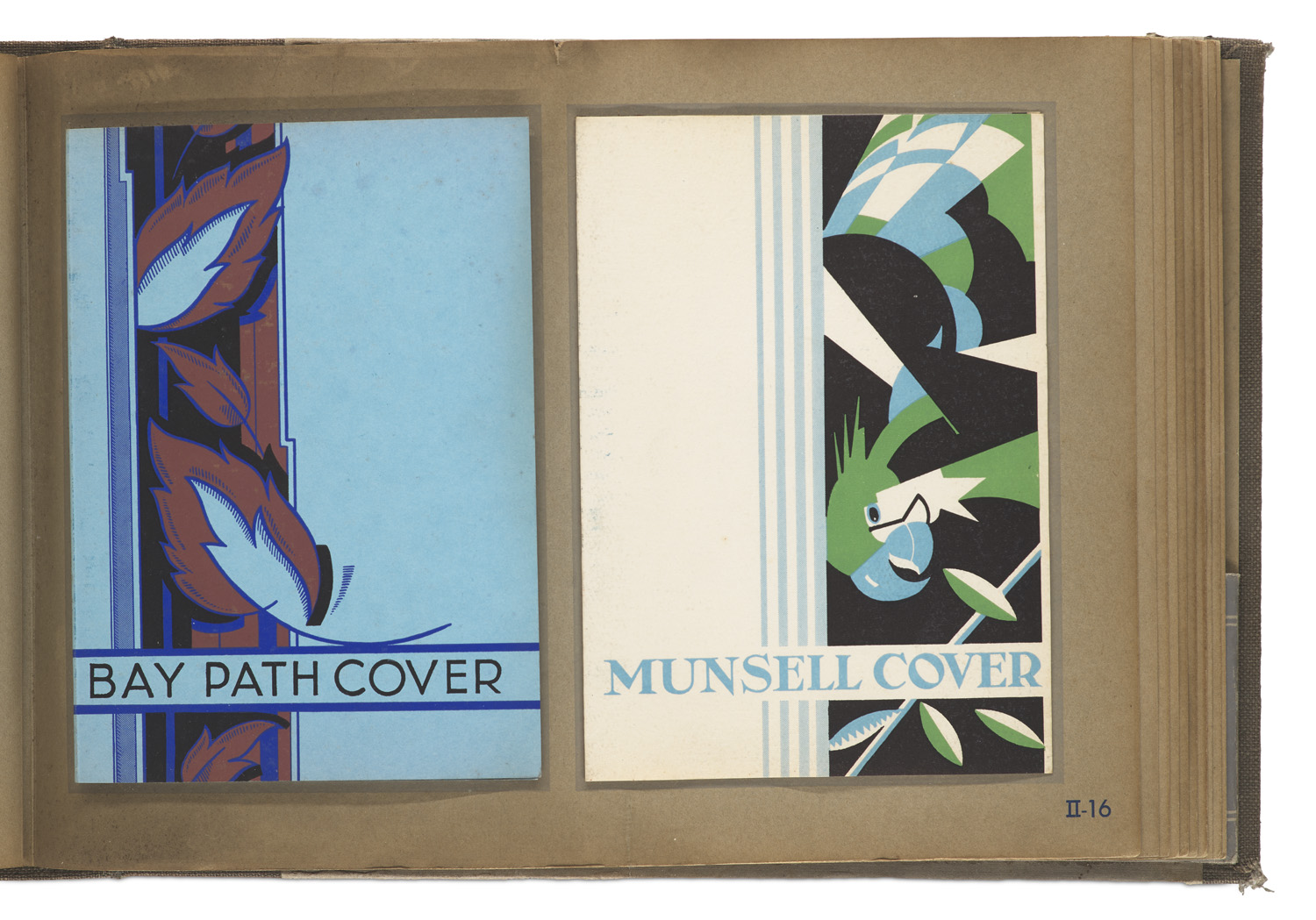 Artistik omslag en tekstpapier. (Musterkatalog mit 73 (v. 80) mehrteiligen Papiermustern im Mehrfarbendruck, auf Karton montiert und rückseitig mit Beschreibungen versehen. (= Ideeal Collectie G.H.B., Gruppe 11, Bd. II). o.O. (Amsterdam et al.), o.J. (um 1930). 22 Bl. Qu.-4°. Orig.-HLwd. mit typographischem Deckel- und Rückentitel (signiert "TB") in silberfarben und schwarz.